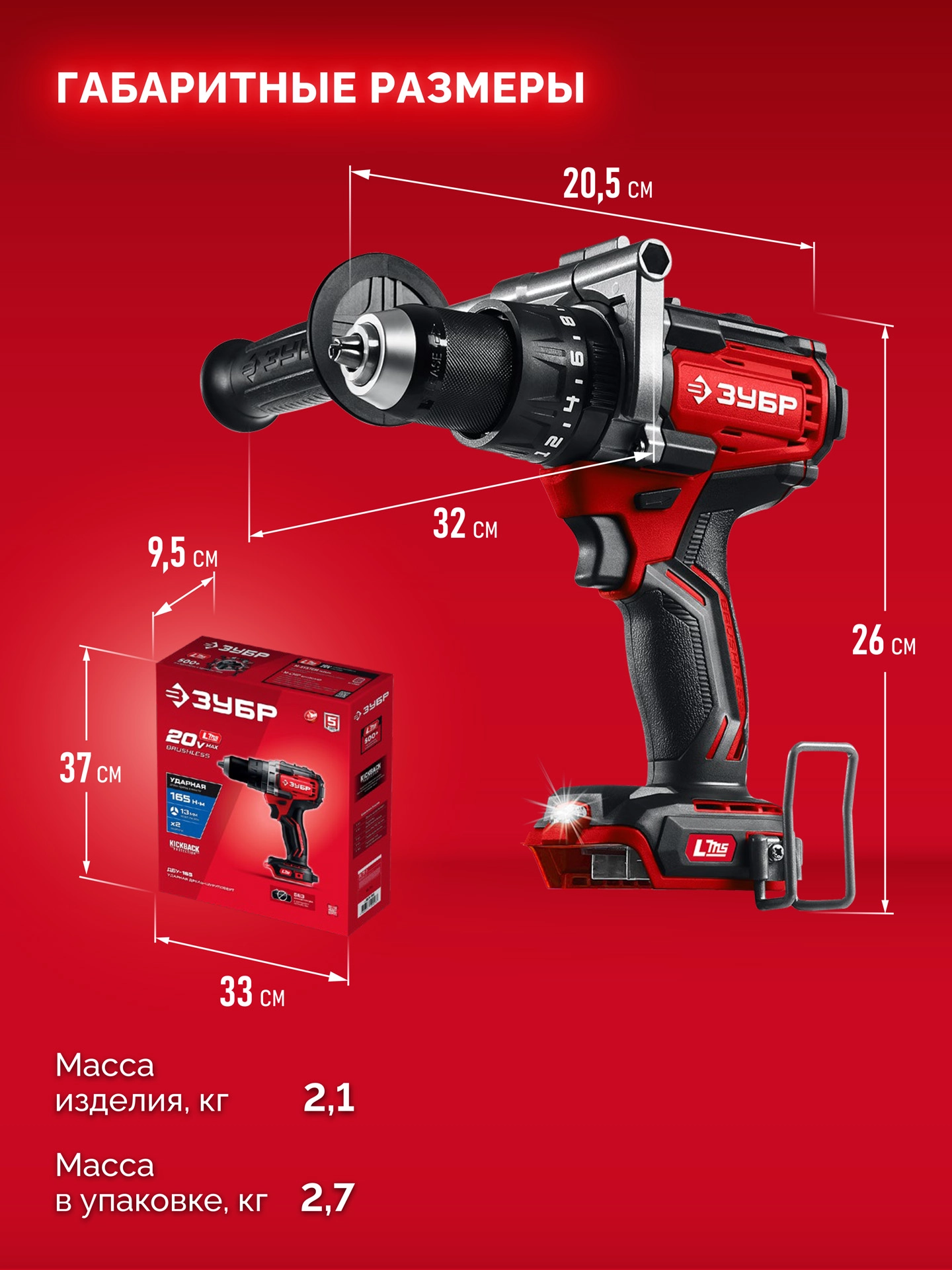 ПроизводителиДрель-шуруповерт ударная аккум. ДБУ-165 (LMS) (20.0 В, без АКБ и ЗУ, 165 Нм, кор.) ЗУБР