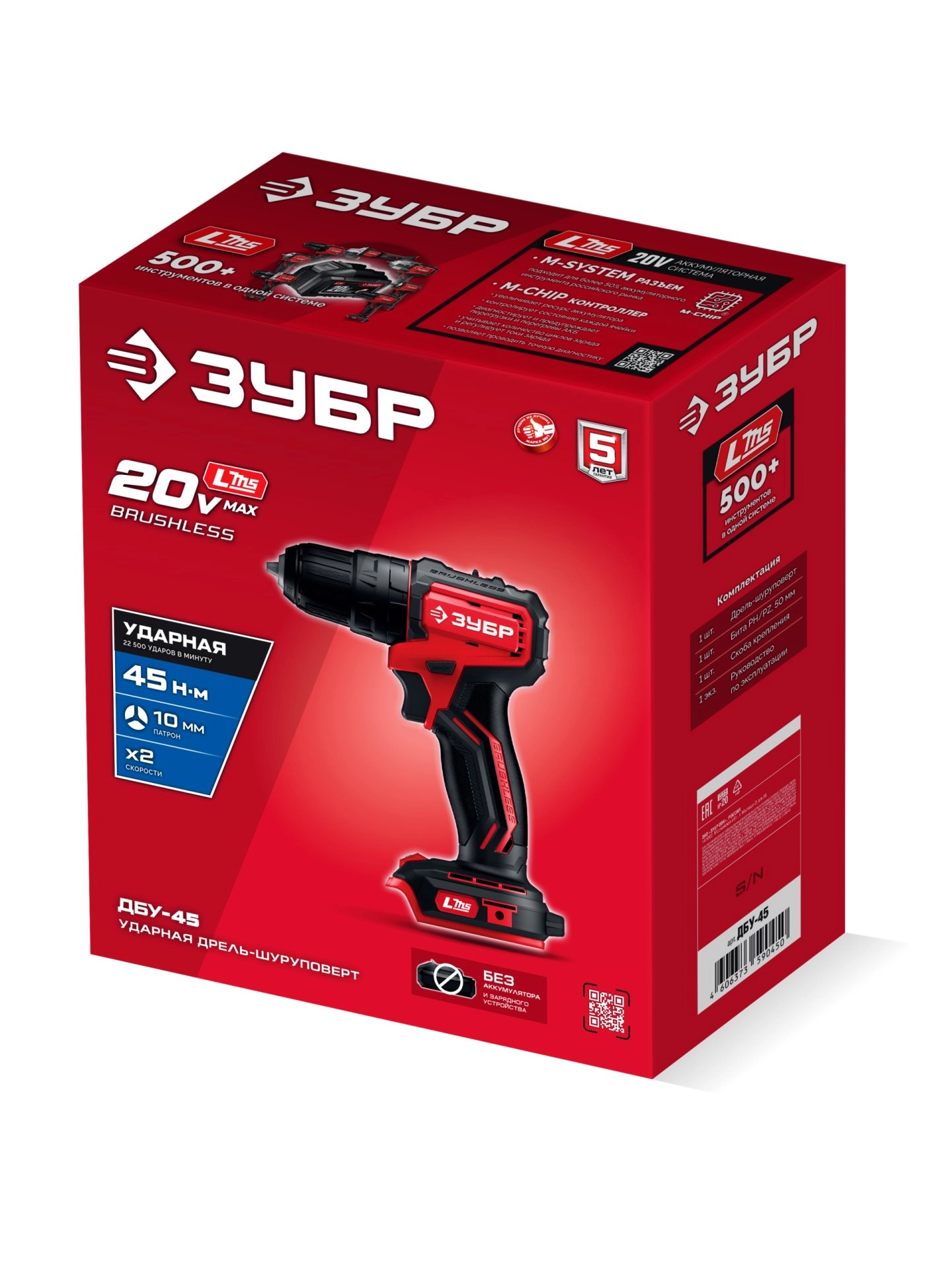 ПроизводителиДрель-шуруповерт ударная аккум. ДБУ-45 (LMS) (20.0 В, без АКБ и ЗУ, 45 Нм, кор.) ЗУБР