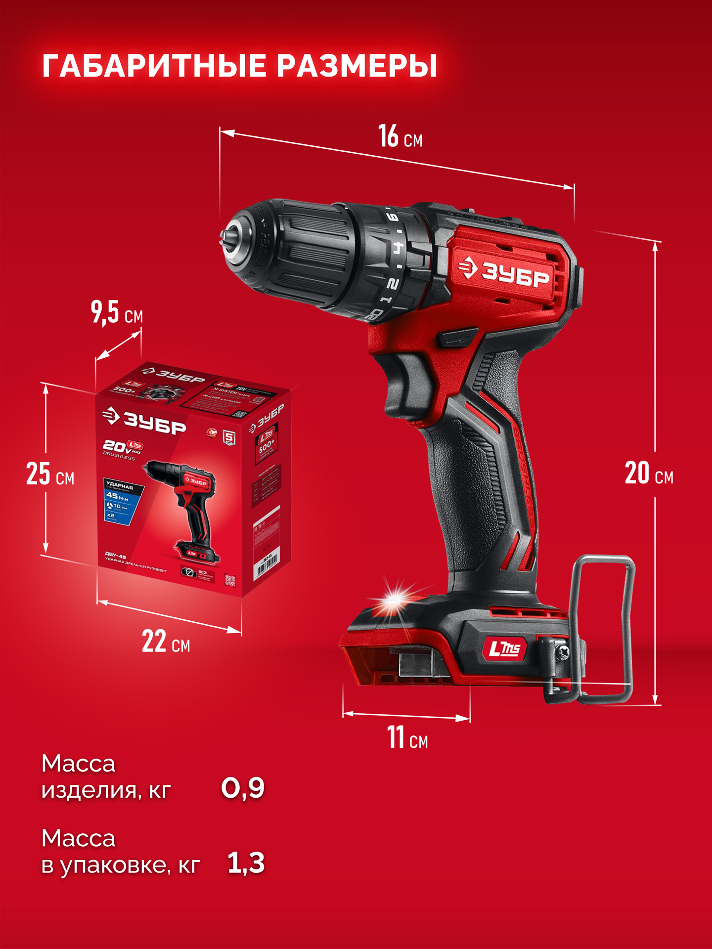 ПроизводителиДрель-шуруповерт ударная аккум. ДБУ-45 (LMS) (20.0 В, без АКБ и ЗУ, 45 Нм, кор.) ЗУБР
