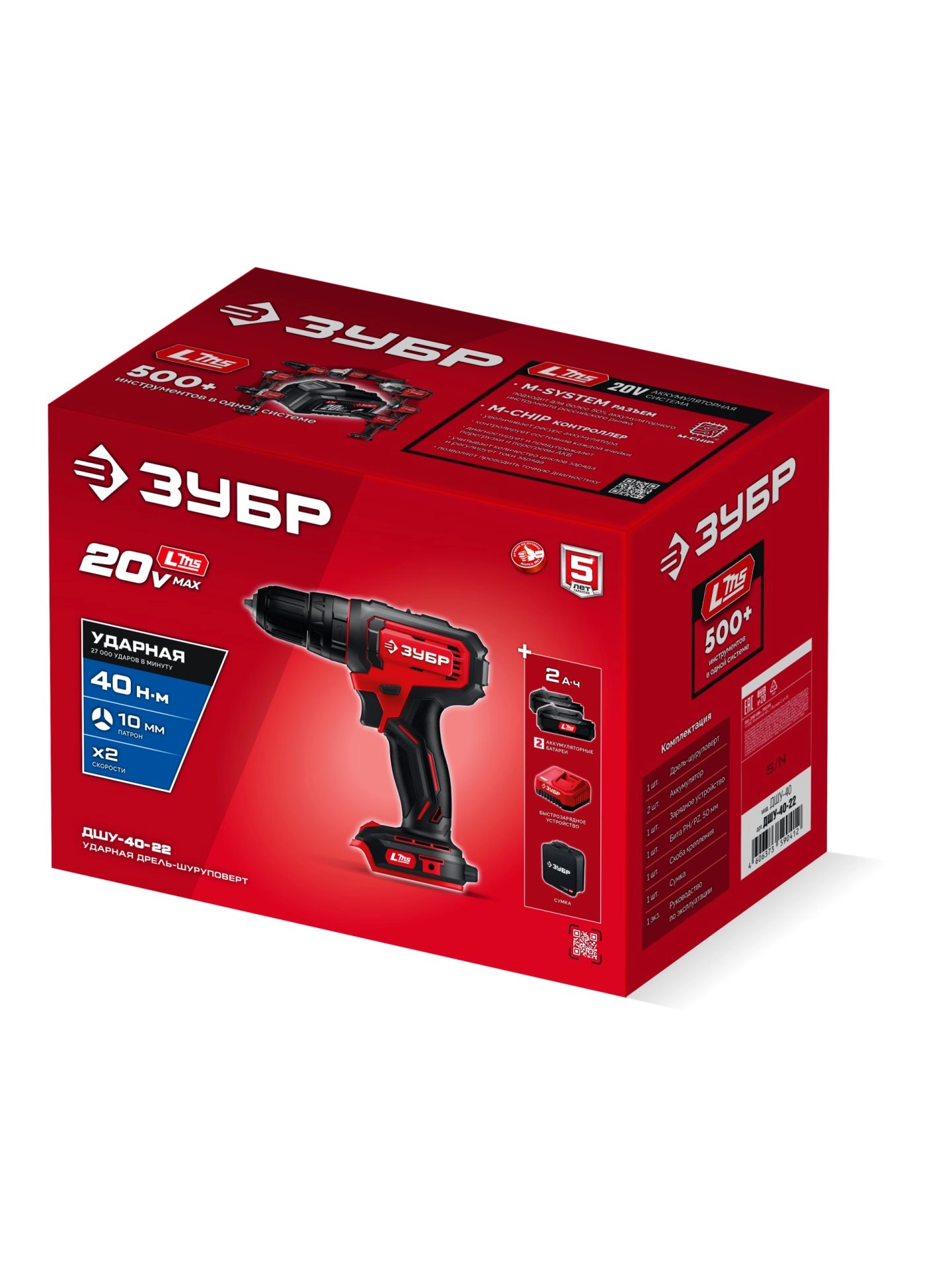 ПроизводителиДрель-шуруповерт ударная аккум. ДШУ-40-22 (LMS) (20.0 В, 2 акк. х 2.0 А/h, 40 Нм, сум.) ЗУБР