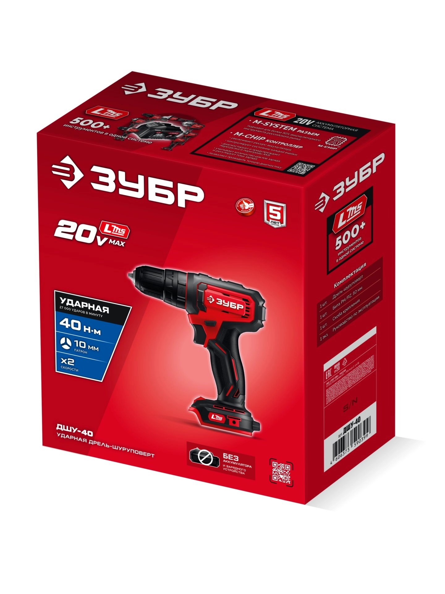 ПроизводителиДрель-шуруповерт ударная аккум. ДШУ-40 (LMS) (20.0 В, без АКБ и ЗУ, 40 Нм, кор.) ЗУБР