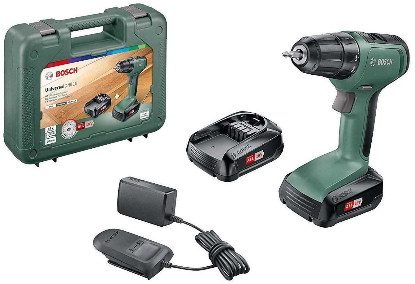 ПроизводителиДрель-шуруповерт UniversalDrill 18 (18.0В,2 акк.х1,5 А/ч Li-Ion,30Нм.,чем.)(0 603 9C8 005) BOSCH