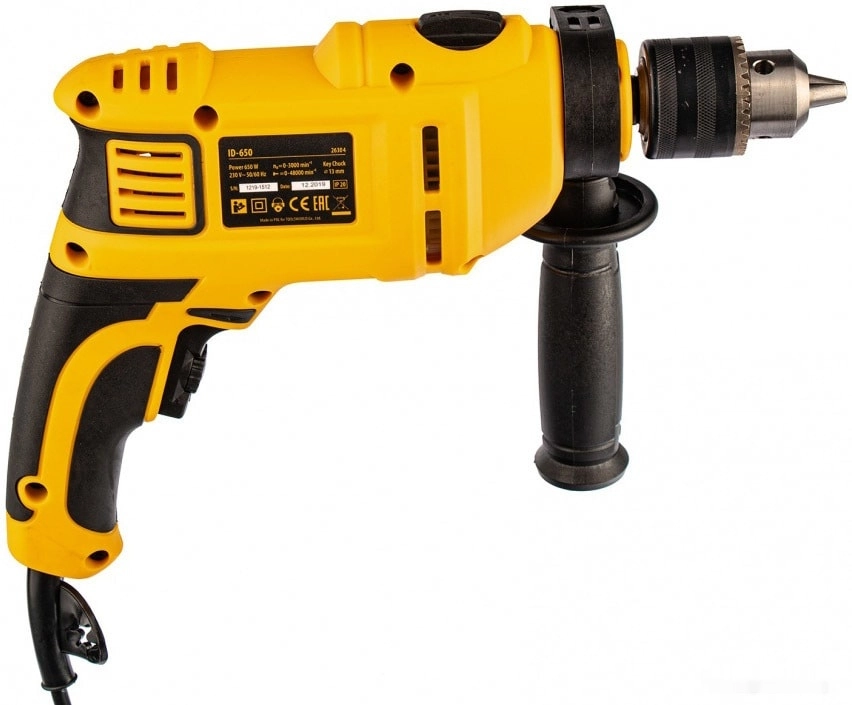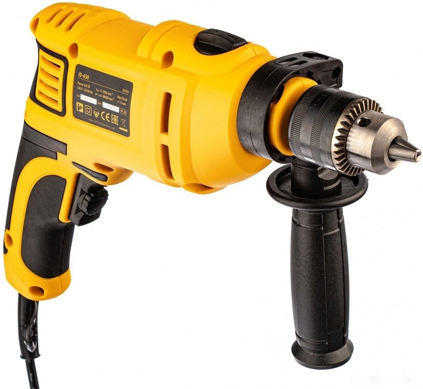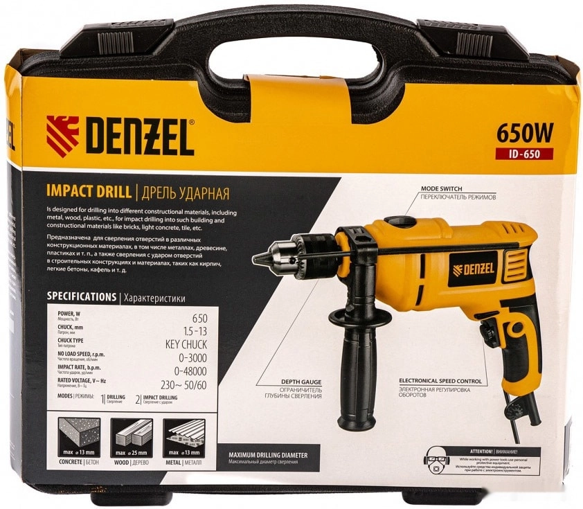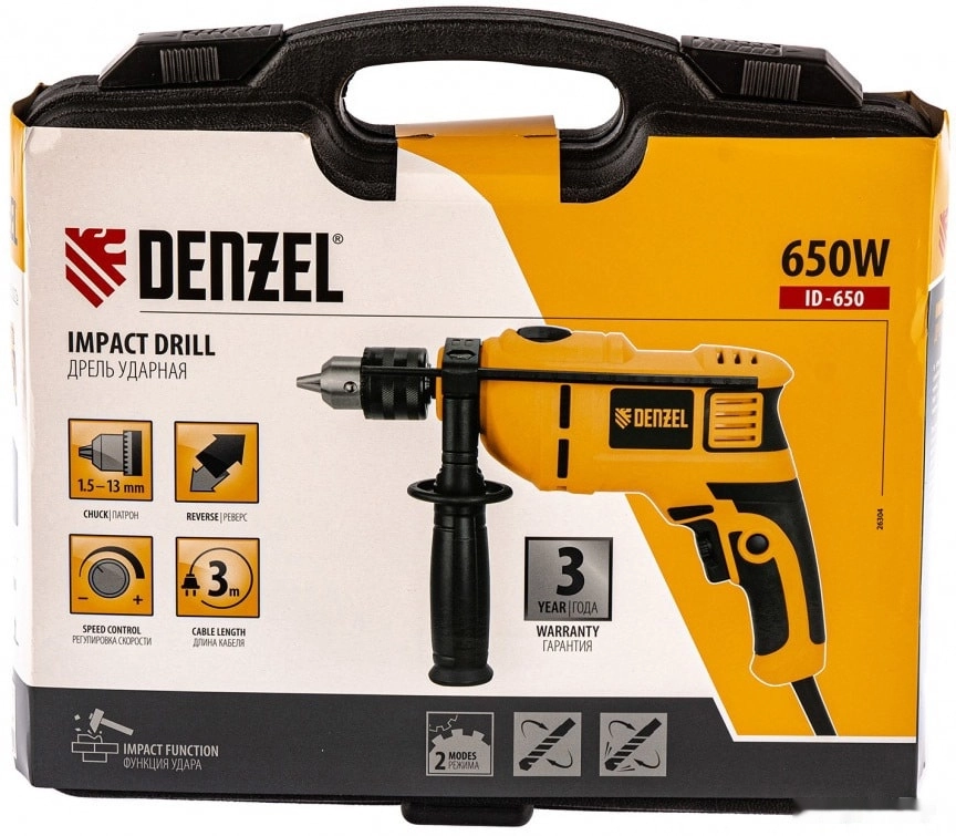 ПроизводителиДрель ударная ID-650, 650 Вт, 0-3000 об/мин, 48000 уд/мин Denzel