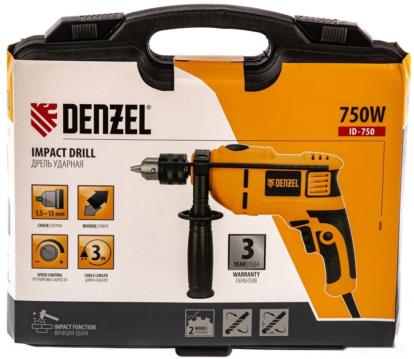 ПроизводителиДрель ударная ID-750, 750 Вт, 0-3000 об/мин, 48000 уд/мин Denzel