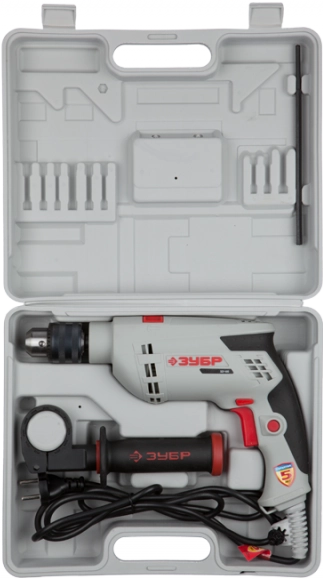 Функция сверления с ударом, широкий диапазон регулировки частоты вращения, удобная дополнительная рукоятка - все, что нужно для качественной работыХарактеристикиАртикул ЗДУ-680 ЭРКМ2Бренды ЗубрСтрана производства КитайТип ударная дрельПотребляемая мощность 680Количество скоростей 1Число оборотов холостого хода 3000Макс. диаметр сверления, дерево 20Макс. диаметр сверления, металл 10Макс. диаметр сверления, бетон 13Скорость вращения 3000Кейс в комплекте естьЗащита от пыли нетРежимы работы сверление с ударомВес 2000Питание сетьПатрон кулачковый (стандартный)Режимы скорости вращения 1Регулировка скорости вращения электроннаяСкорость удара 48000Реверс естьДополнительная рукоятка естьКейс естьПылесборник нетПодсветка нетСтандартный кулачковый патрон естьКлюч для патрона естьФиксация кнопки включения ДаОписание товара обновлено 08.12.2025 14:10:14Незаменимый помощник для сверления отверстий в различных материалах (дерево, сталь и т. д.). Универсальная дрель с качественным кулачковым патроном, плавной регулировкой оборотов и надежной конструкцией на подшипниках - лучший подарок мастеру.Функция сверления с ударом, широкий диапазон регулировки частоты вращения, удобная дополнительная рукоятка - все, что нужно для качественной работы