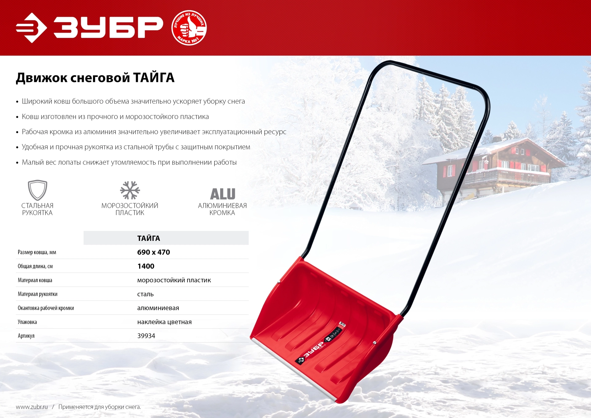 Снеговой движок ЗУБР Тайга 39934 используется для очистки территорий от снега.