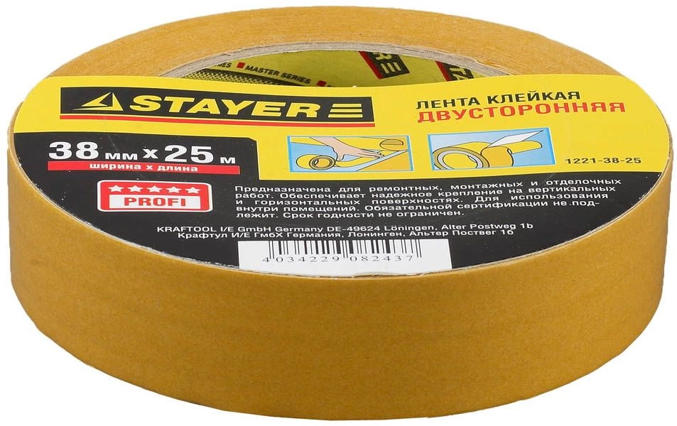 ПроизводителиЛента клеящая на полипропиленовой основе 38мм/25м, двусторонняя (1221-38-25) STAYER