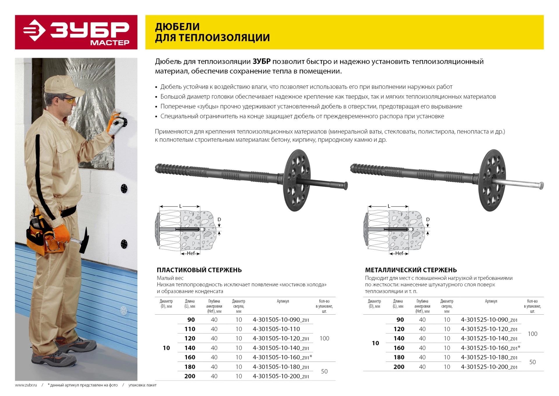 ПроизводителиДюбель для теплоизоляции пласт. стержень Ø 10x160 мм, 100шт. (4-301505-10-160_z01) ЗУБР