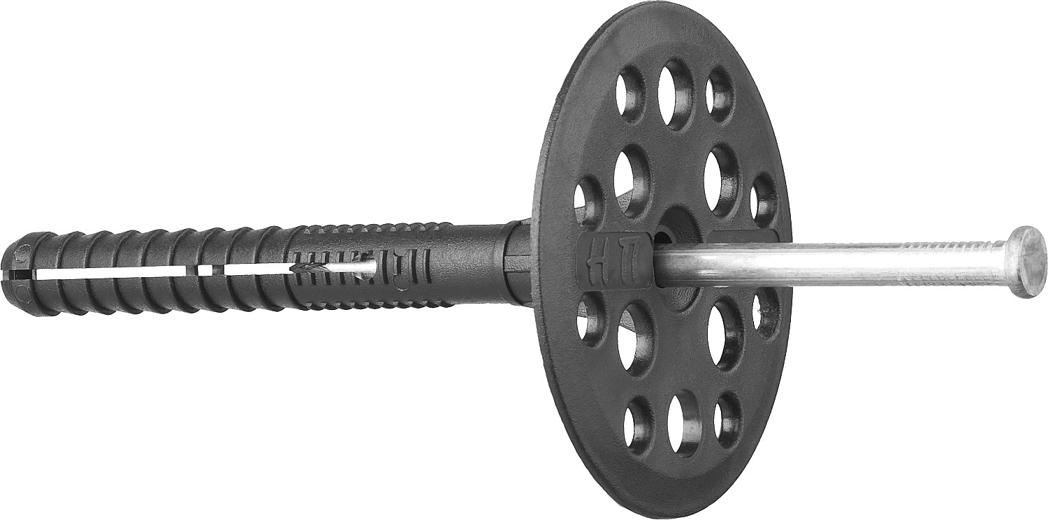 Большой диаметр головки дюбеля позволяет крепить как твердые, так и мягкие теплоизоляционные материалы (минеральную вату, стекловату, полистирол, пенопласт и др.).