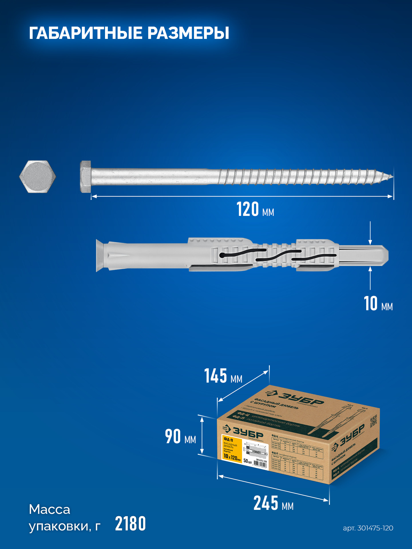 ПроизводителиДюбель фасадный, нейлон/цинк ФД-П 10х120мм, 50 шт (301475-120) ЗУБР