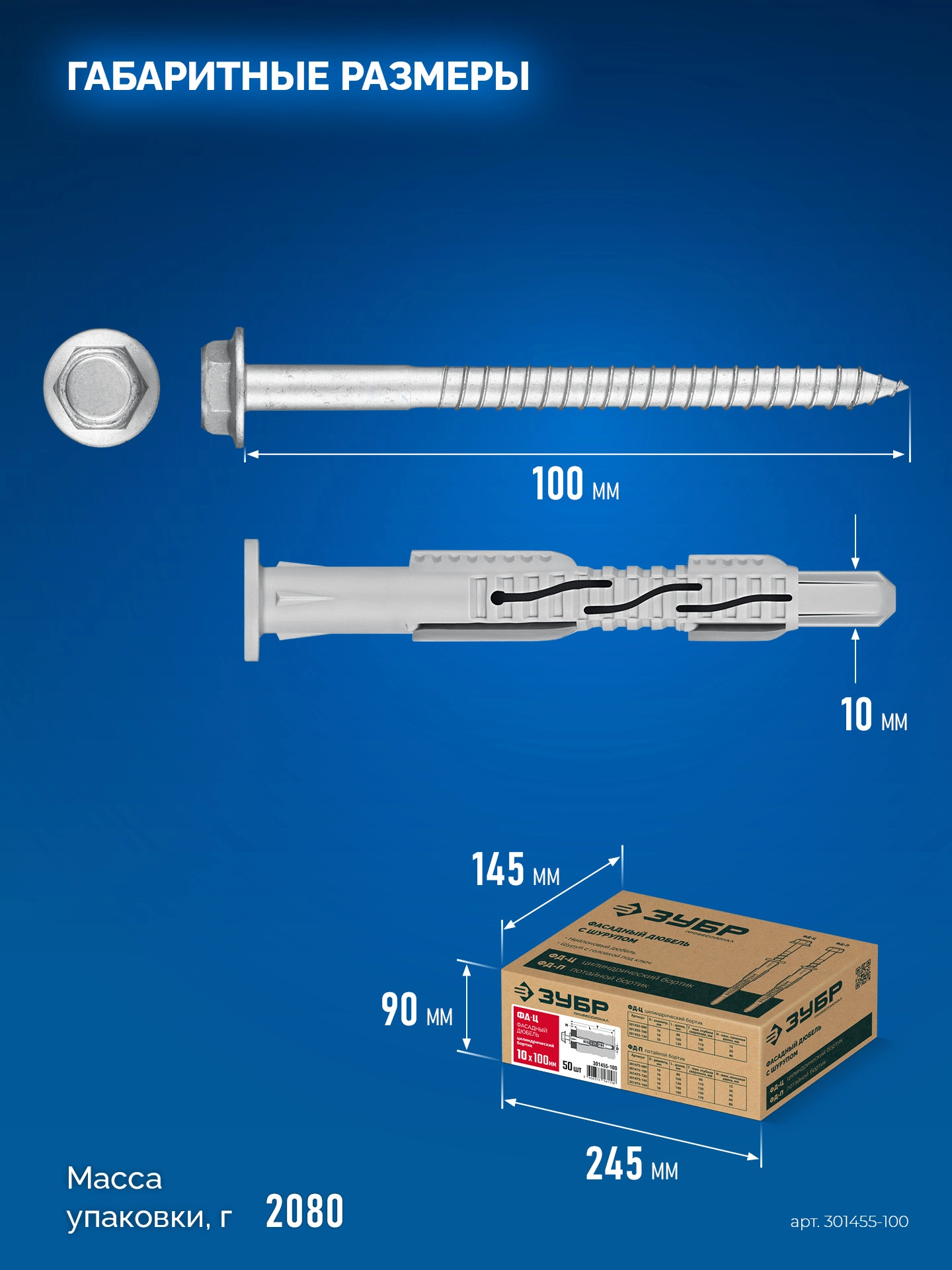 ПроизводителиДюбель фасадный, нейлон/цинк ФД-Ц 10х100мм, 50 шт (301455-100) ЗУБР