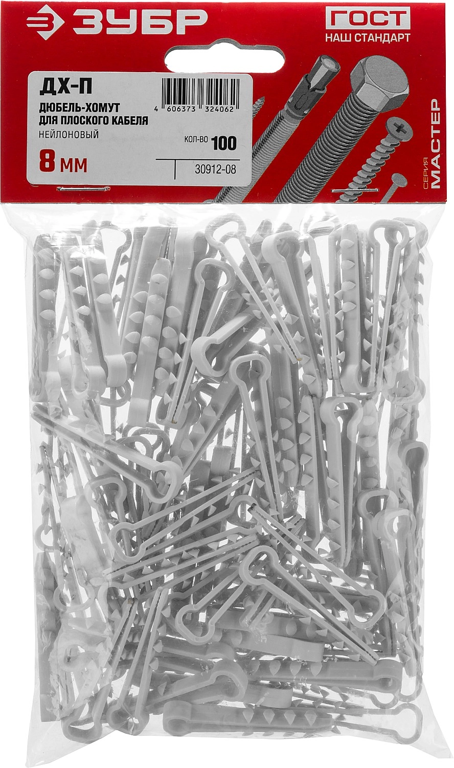 ПроизводителиДюбель-хомут для плоского кабеля нейлон Ø 8мм, 100шт. (30912-08) ЗУБР