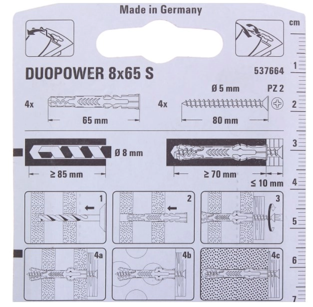ПроизводителиДюбель распорный DUOPOWER 8x65 с саморезом (упак. 4шт.) Fischer