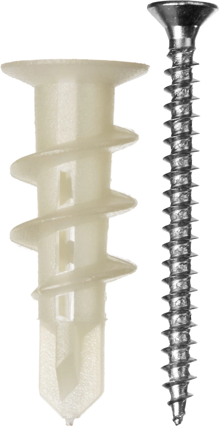 Высокая резьба с крупным шагом увеличивает площадь контакта и фиксирует дюбель в гипсокартоне, не разрушая его;