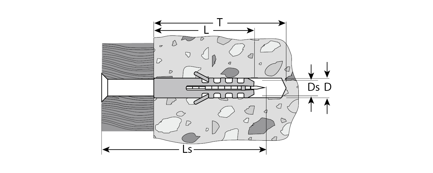 Применяются в полнотелых строительных материалах (бетон, кирпич, природный камень). Диаметр предварительного сверления: 5 мм;