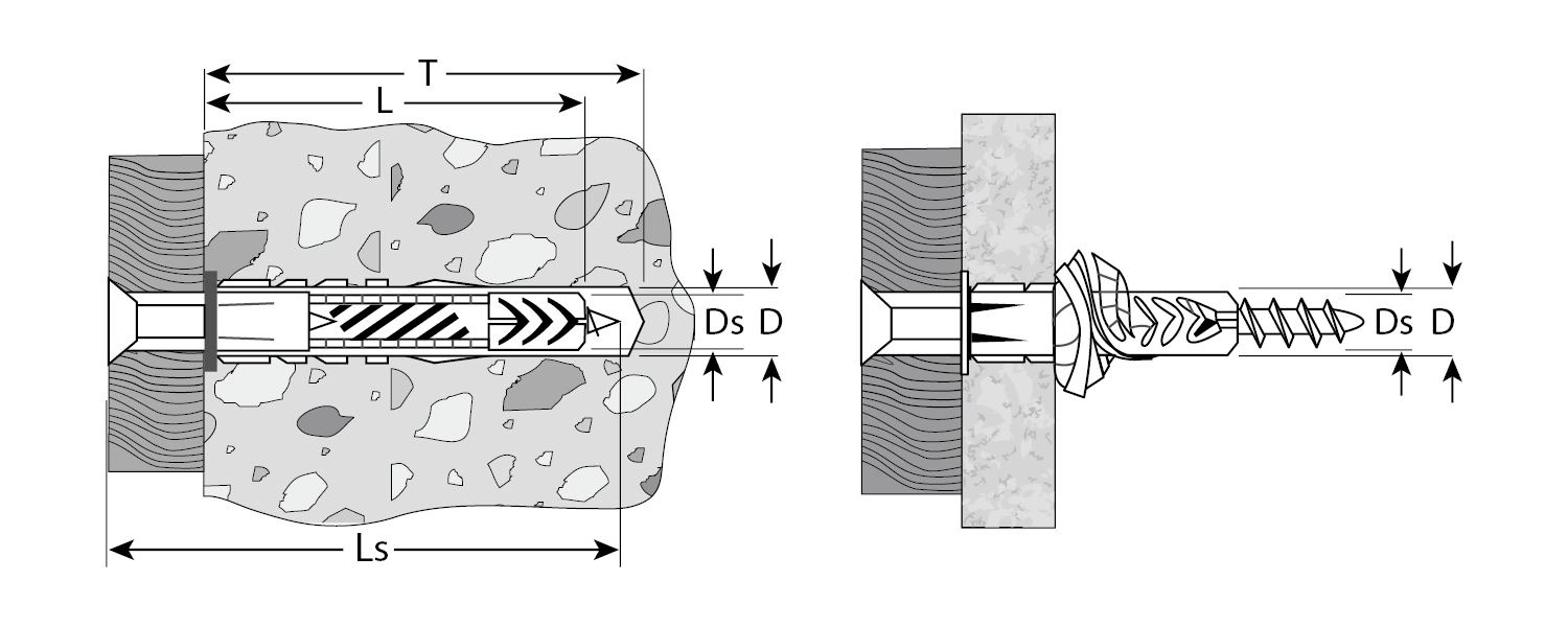 Применяются в полнотелых и пустотелых строительных материалах (бетон, кирпич, природный камень, тонкие стены, блоки и т.п.). Крепление элементов конструкций осуществляется при помощи шурупов (входят в комплект поставки). Диаметр предварительного сверления: 10 мм;