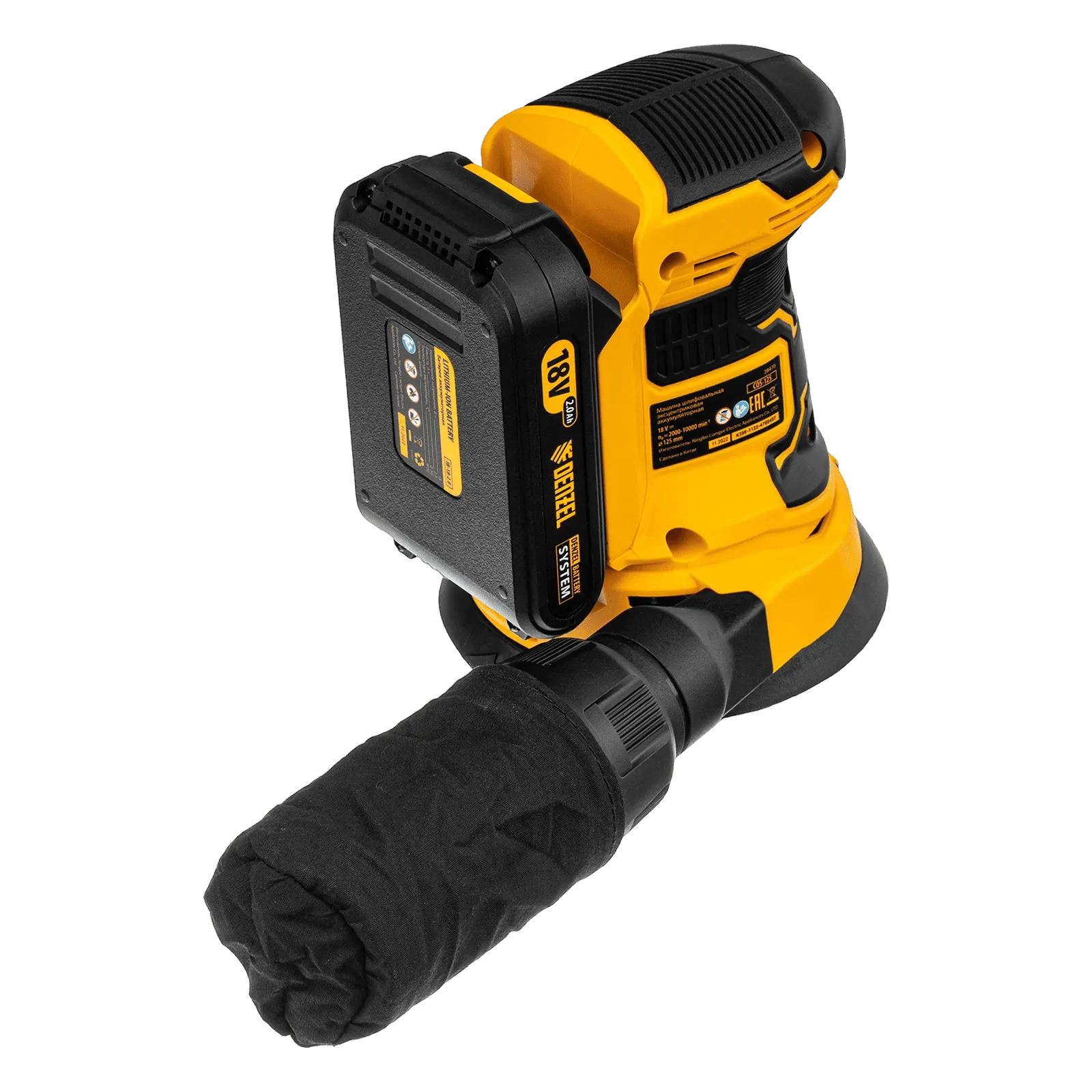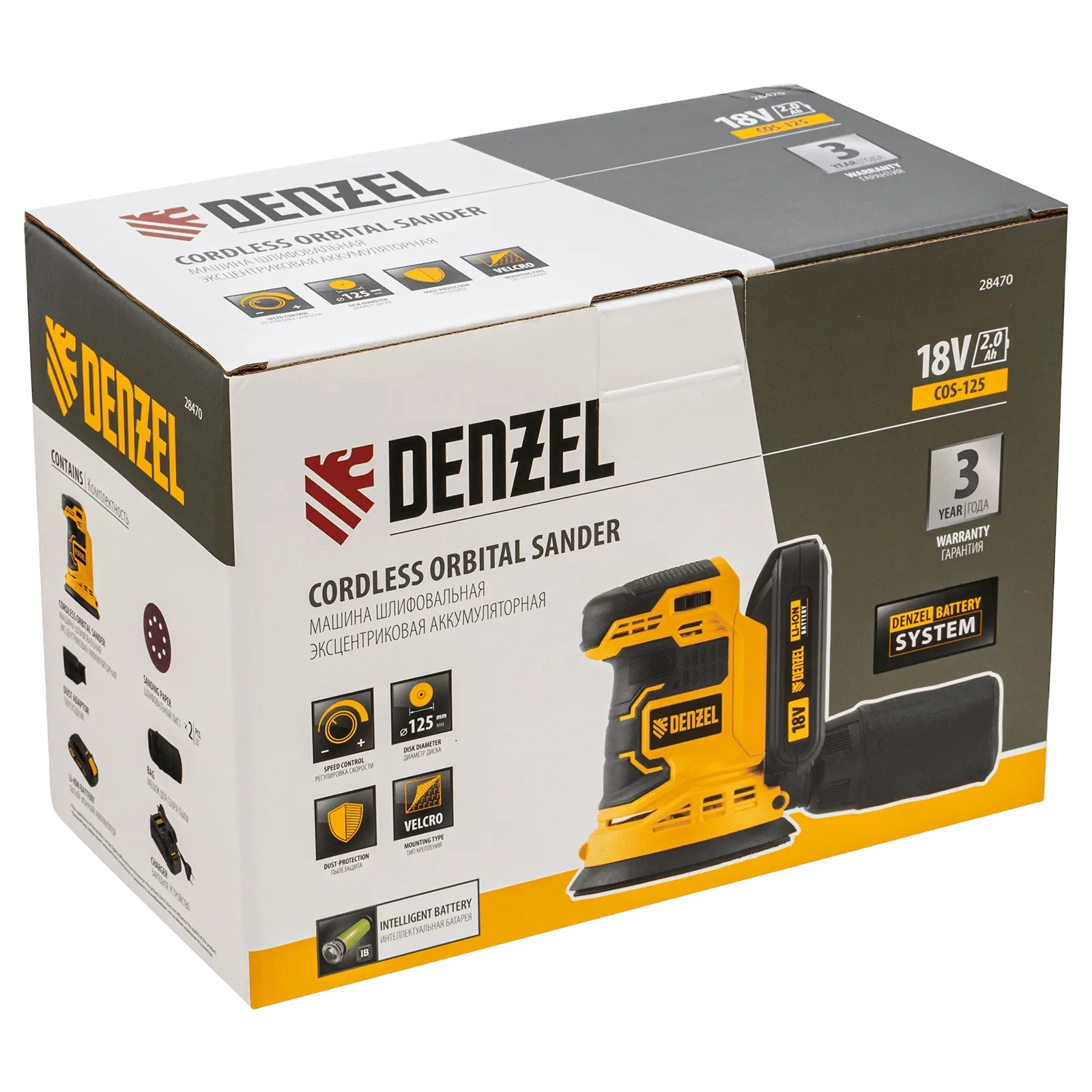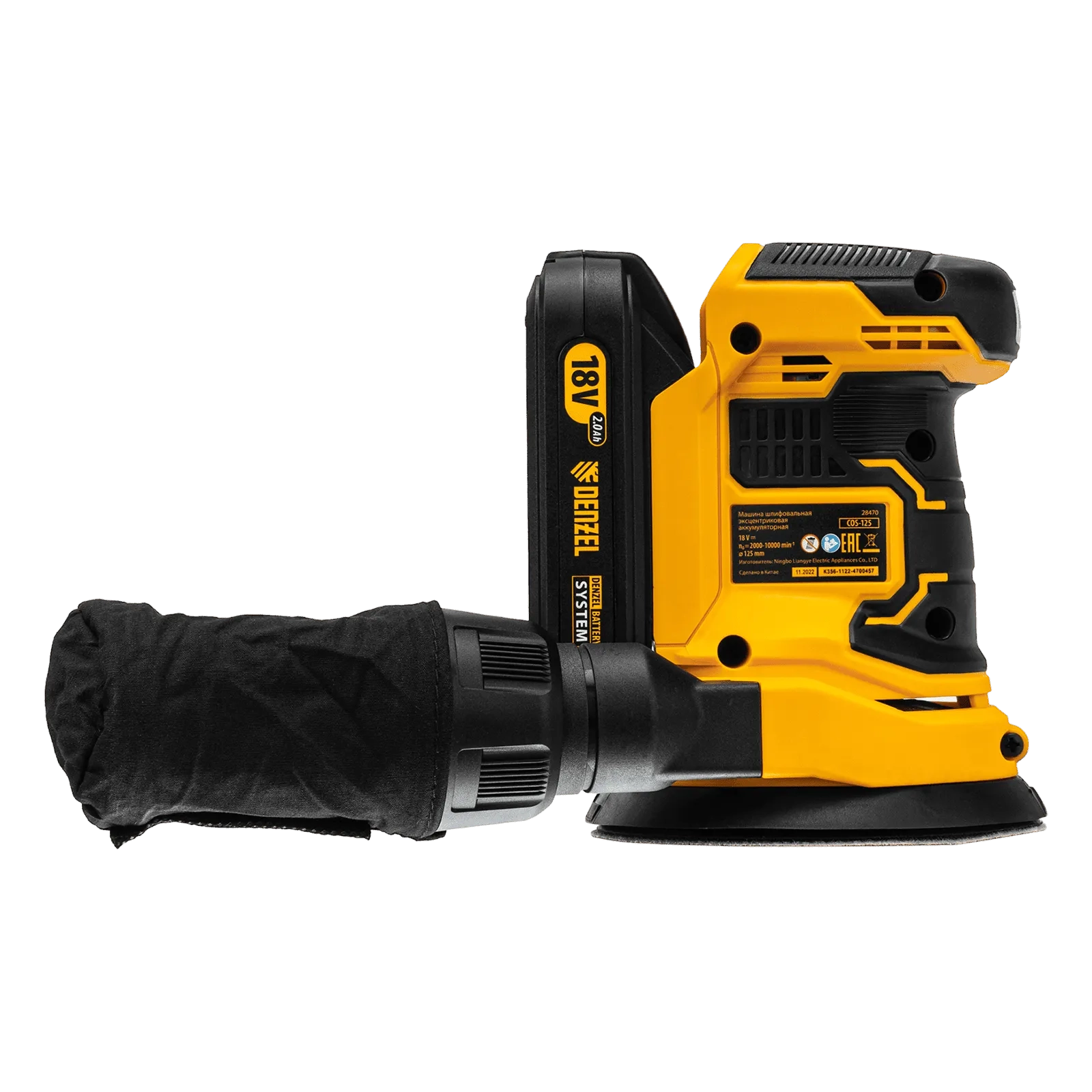 ПроизводителиЭксцентриковая шлифмашина аккум. COS-125, 18В Li-Ion Denzel