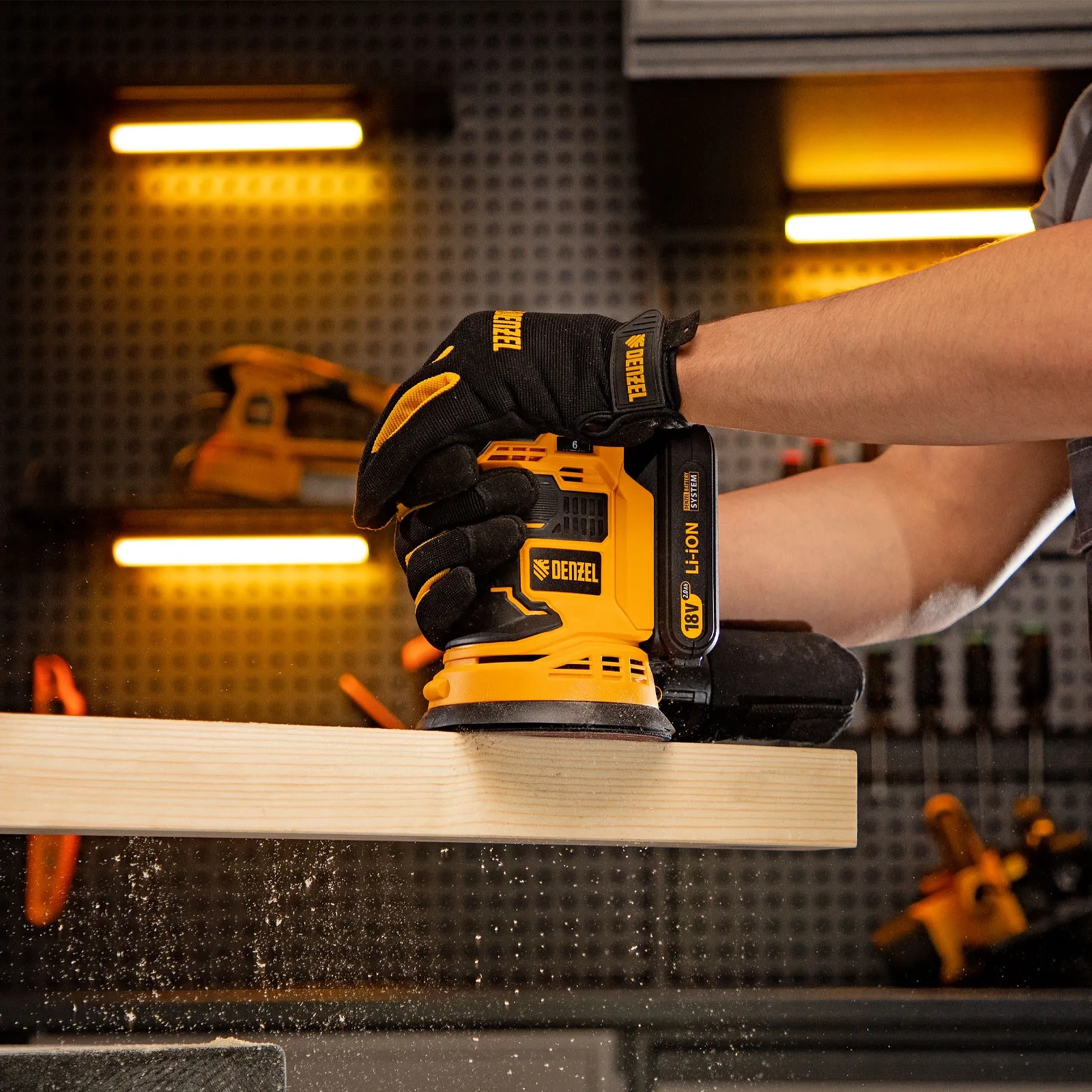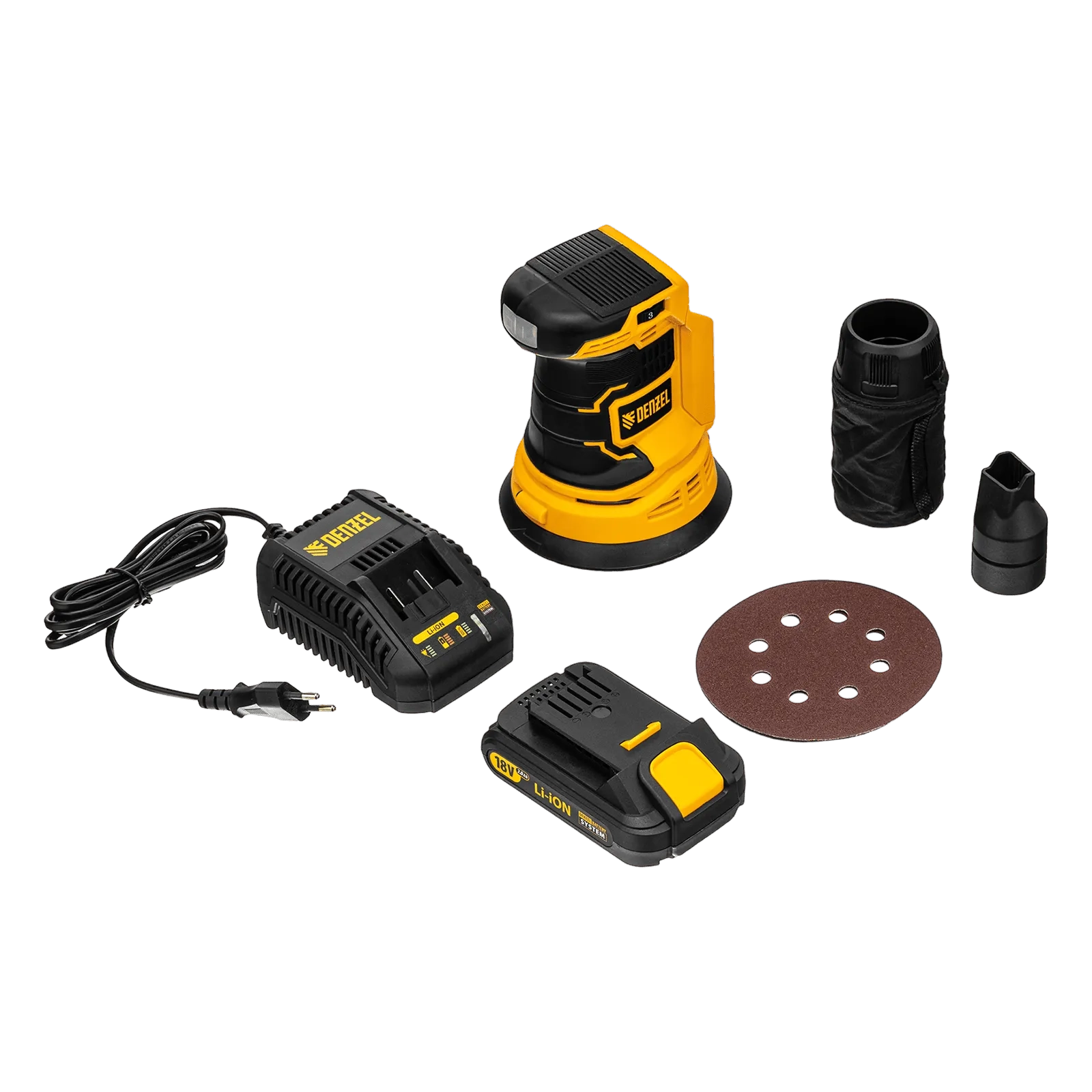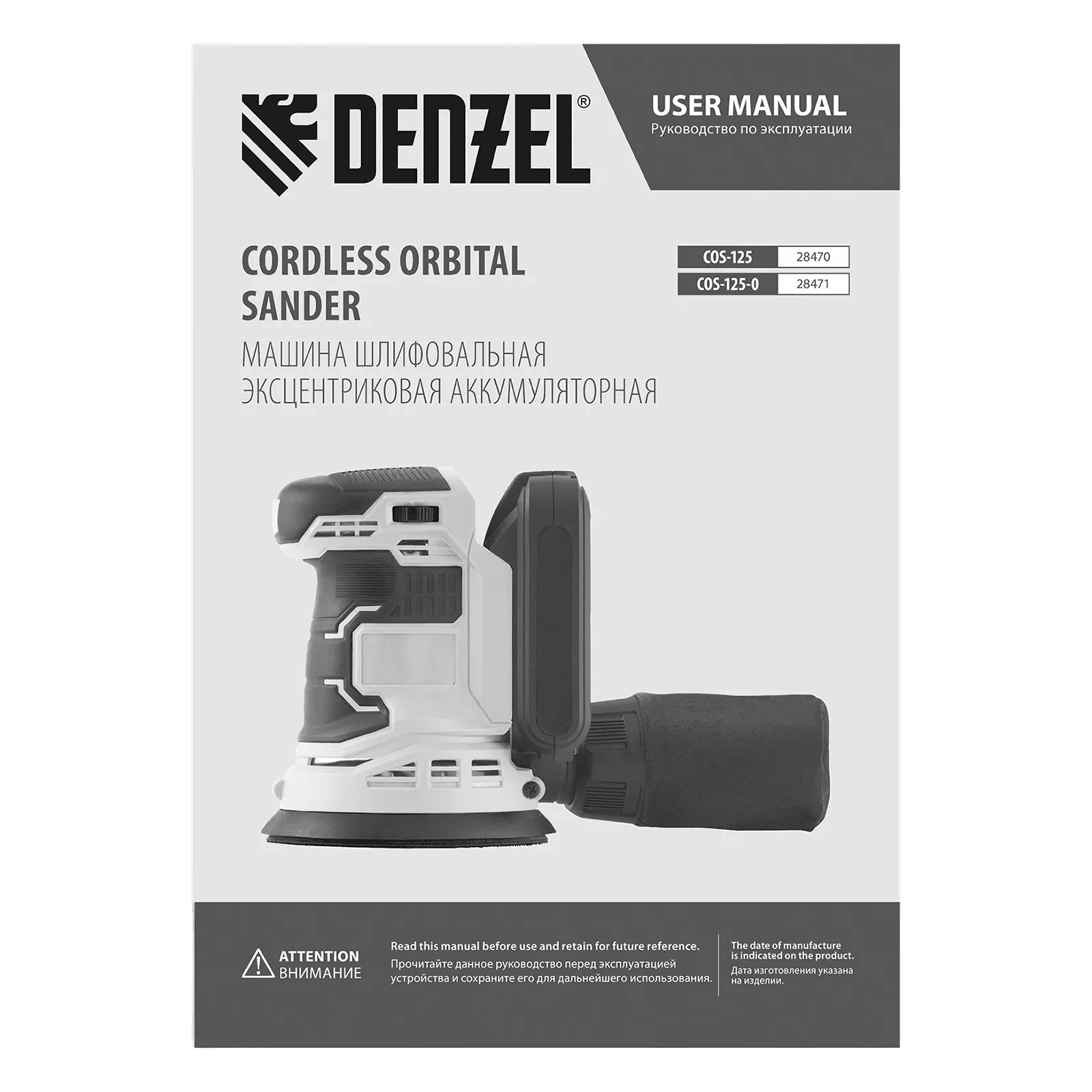 ПроизводителиЭксцентриковая шлифмашина аккум. COS-125, 18В Li-Ion Denzel