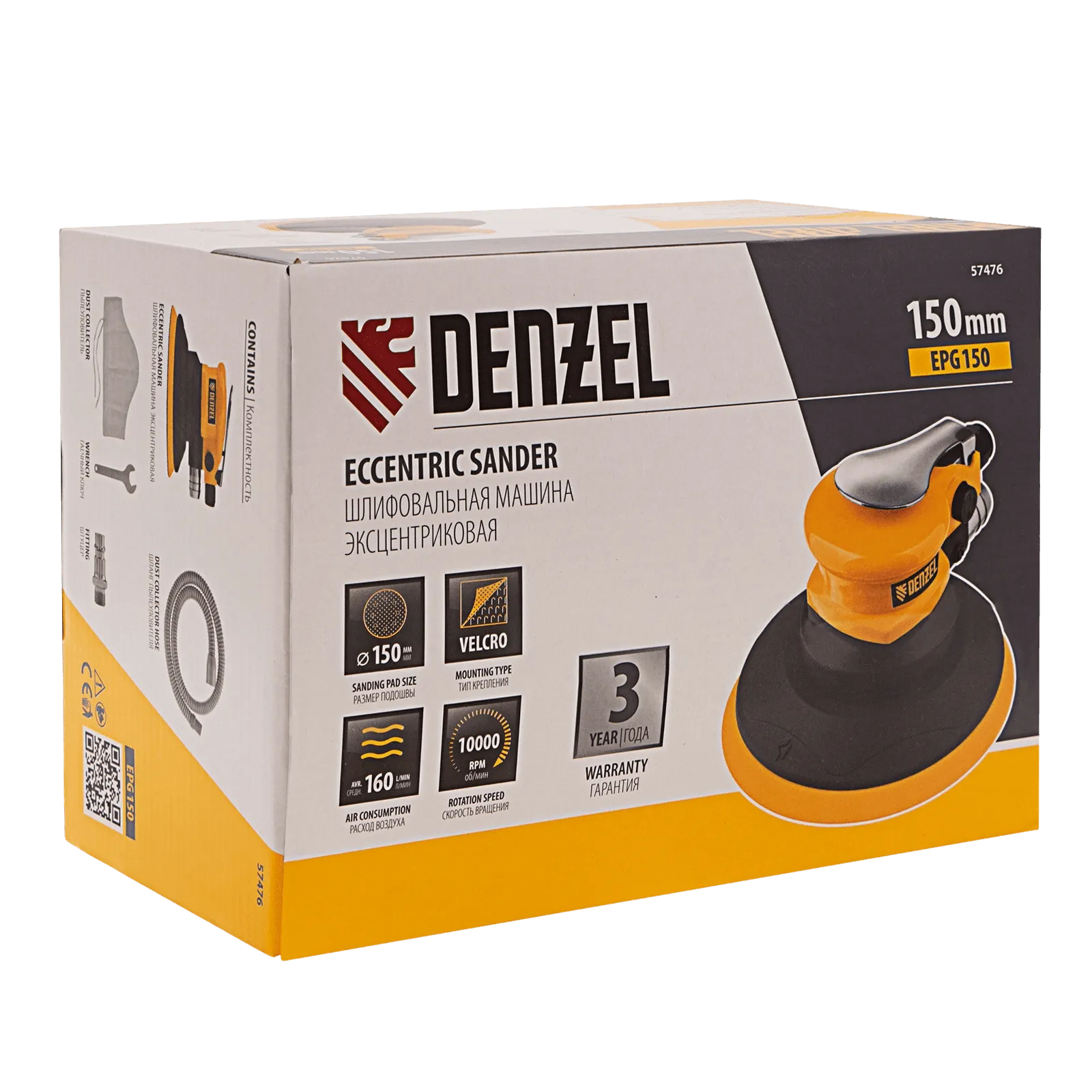 ПроизводителиЭксцентриковая шлифмашина EPG150, 150 мм, 10000 об/мин, 5 мм, 160 л/мин Denzel