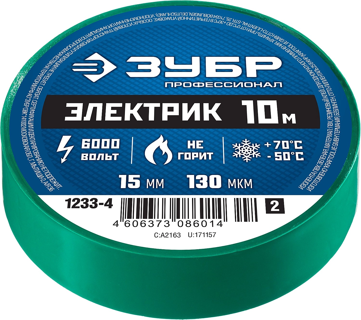 ПроизводителиИзолента ПВХ, 15мм/10м, зеленая "Электрик-10" "ПРОФЕССИОНАЛ" (1233-4_z02) ЗУБР