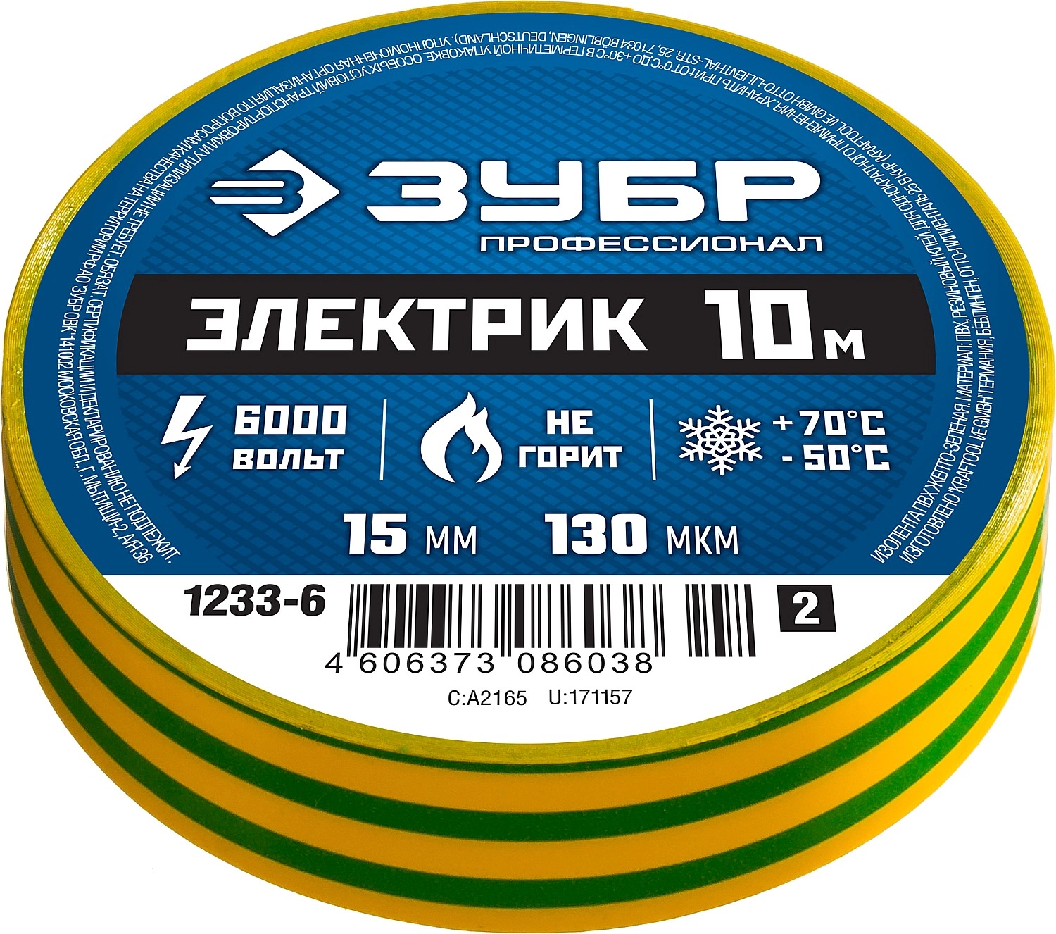 ПроизводителиИзолента ПВХ, 15мм/10м, желто-зеленая "Электрик-10" "ПРОФЕССИОНАЛ" (1233-6_z02) ЗУБР
