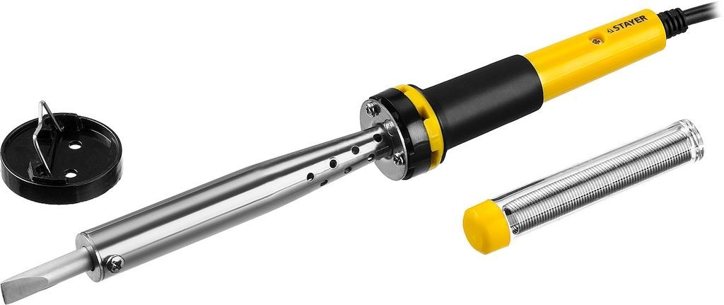 ПроизводителиПаяльник STAYER "PROFI" с двухкомпонентной рукояткой и долговечным жалом, в комплекте (припой и подс