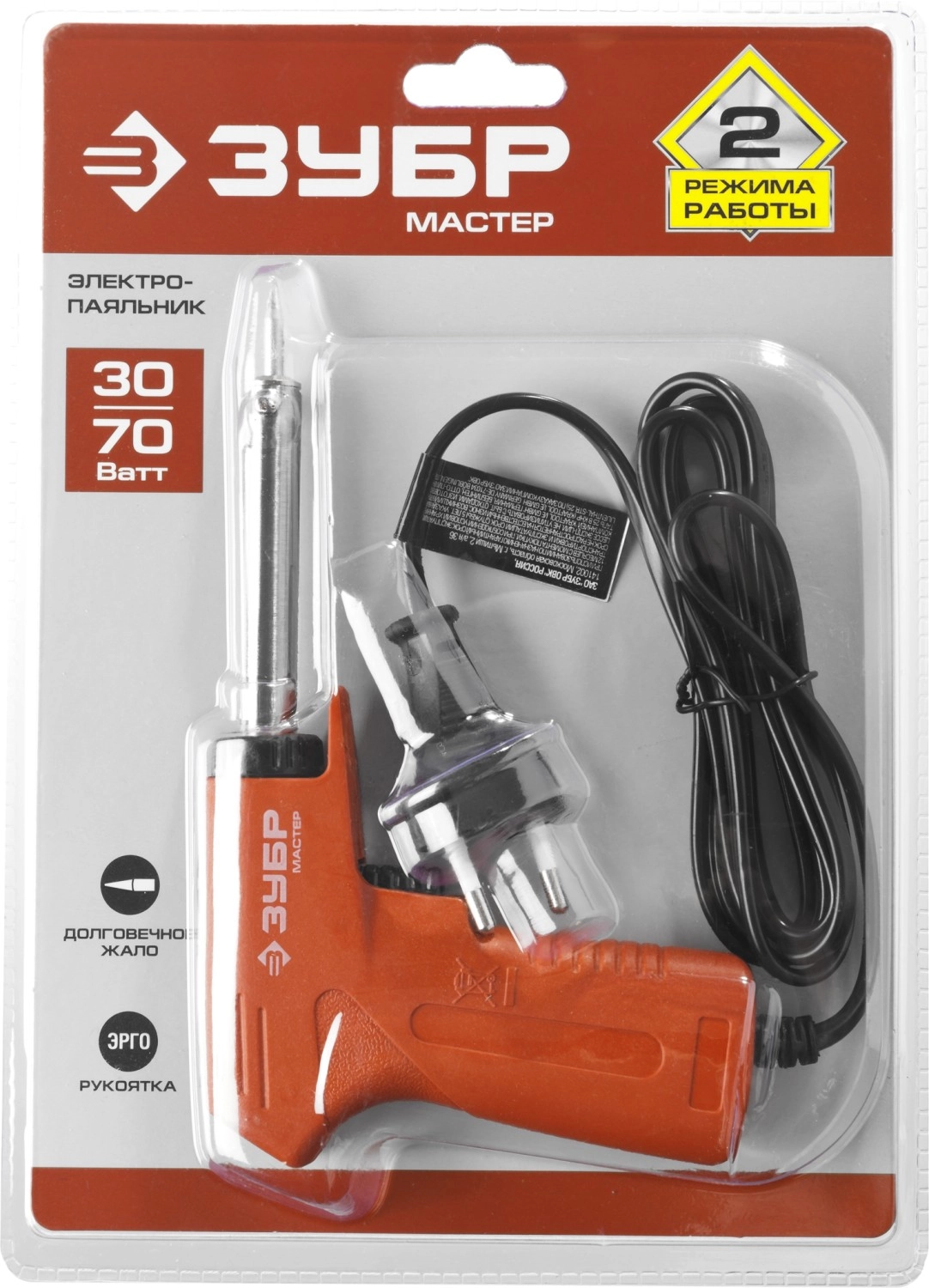 ПроизводителиПаяльник ЗУБР "МАСТЕР", 2 уровня мощности, пистолетная рукоятка, 30 - 70 Вт