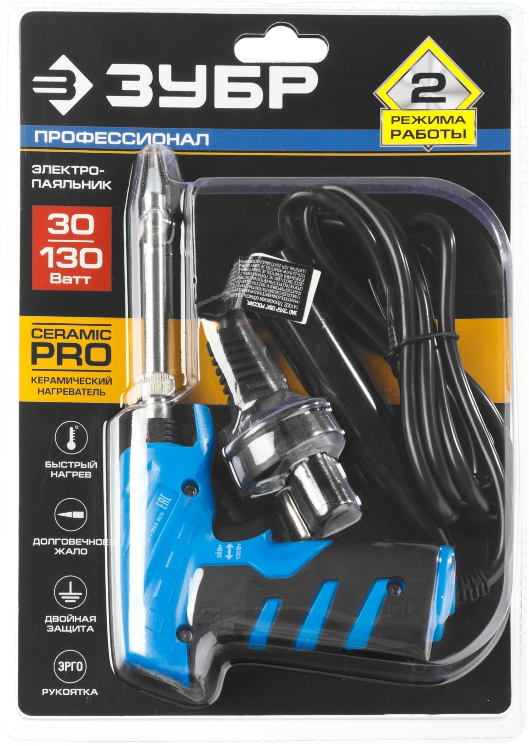 ПроизводителиПаяльник ЗУБР "ПРОФЕССИОНАЛ" "ТУРБО", 2 уровня мощности, пистолетная рукоятка, 30Вт и 130Вт, конус