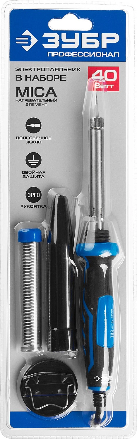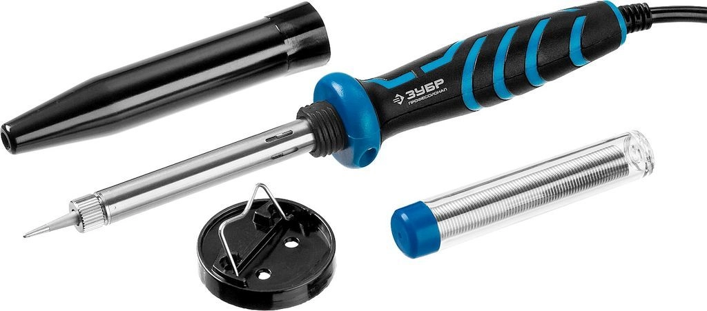 ПроизводителиПаяльник ЗУБР "ПРОФЕССИОНАЛ" с двухкомпонентной рукояткой и защитным колпачком в наборе с припоем и