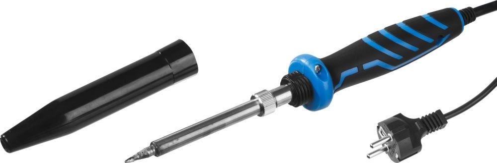 Паяльник оснащен медным жалом со специальным покрытием, обеспечивающим качественную пайку. Легкая двухкомпонентная эргономичная рукоятка.