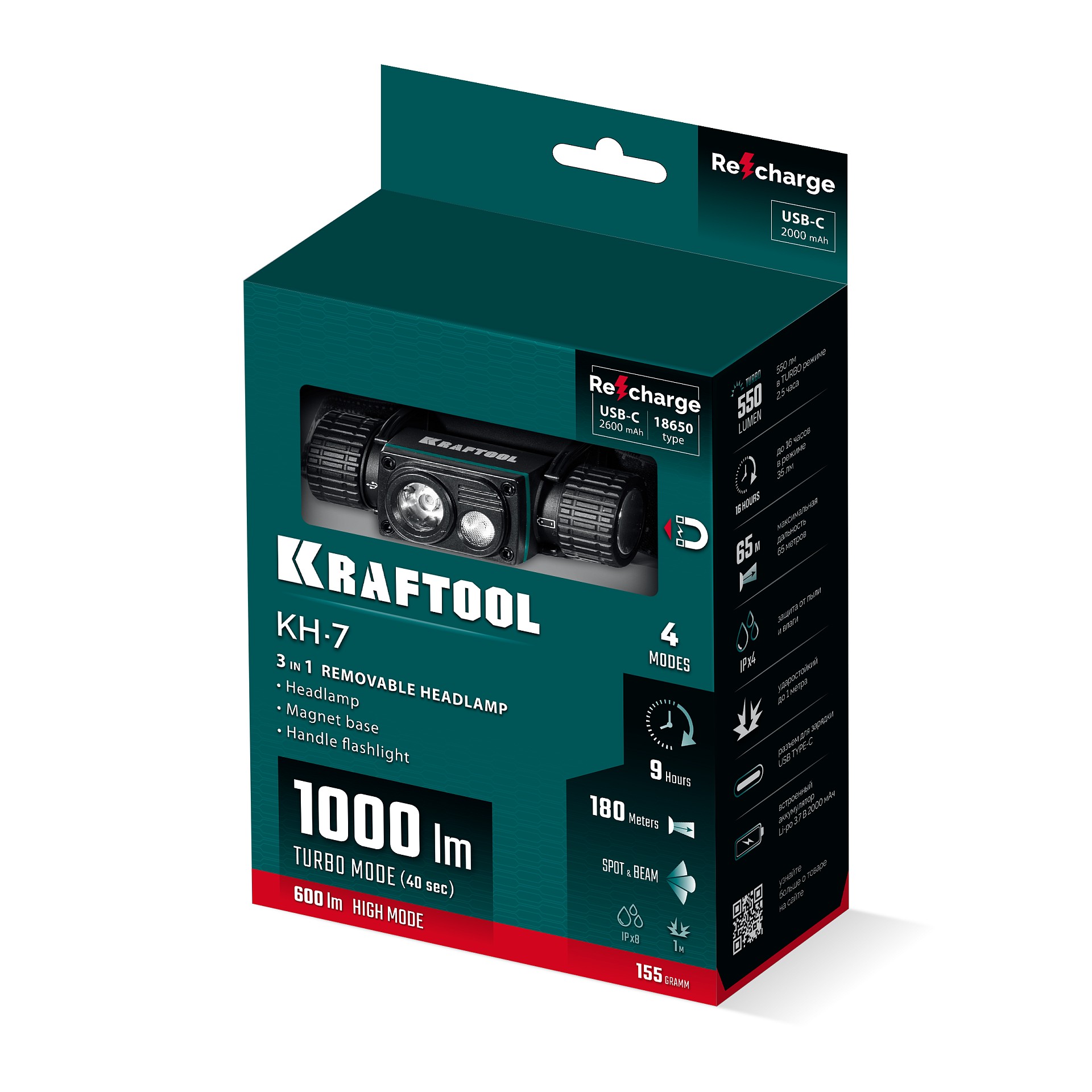 ПроизводителиФонарь налобный светодиодный аккум., 1000 Лм, 180 метров, 4 режима, 3 в 1 "KH-7" (56450) KRAFTOOL