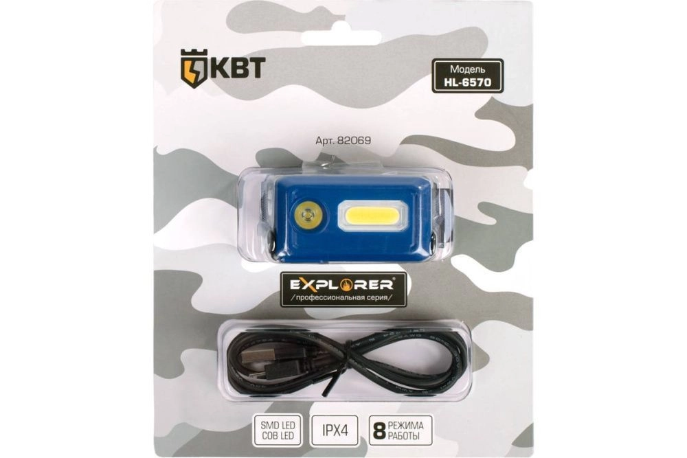 ПроизводителиФонарик налобный HL-6570 (COB, 140лм, 40м, 8 режимов, IPX4) "Explorer"(82069) КВТ