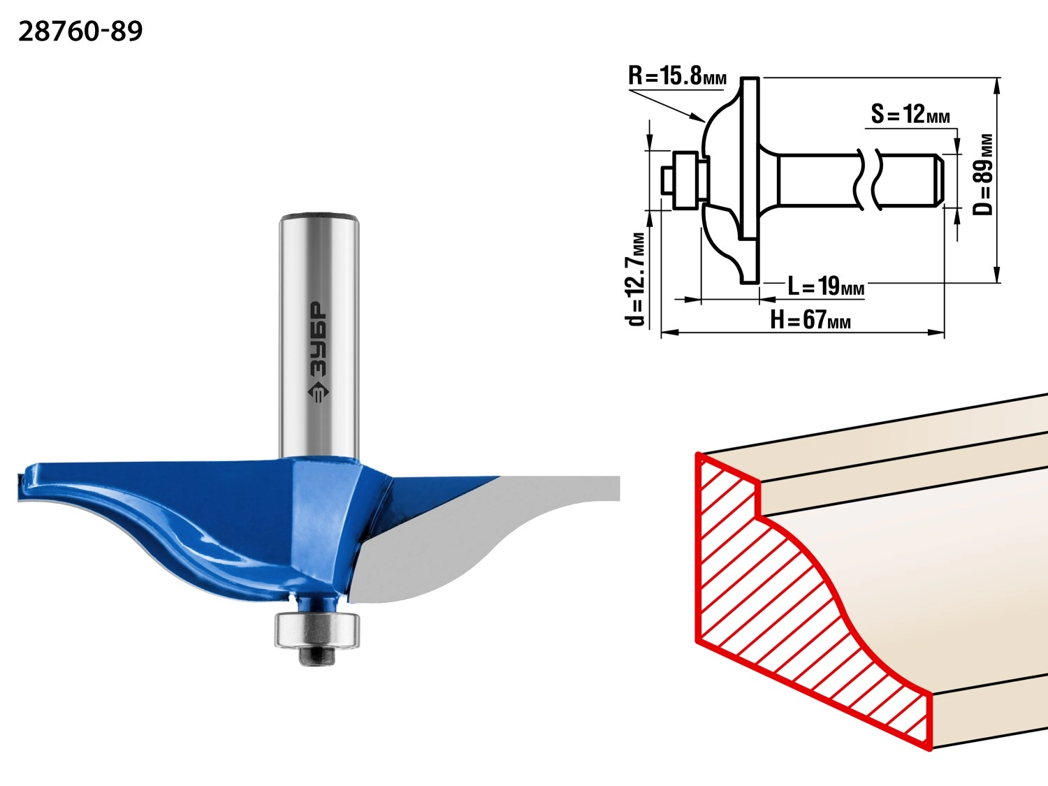ПроизводителиФреза фигирейная №1, D= 89мм, рабочая длина-19мм, радиус-15,8мм, хв.-12мм, d-12,7мм (28760-89) ЗУБР
