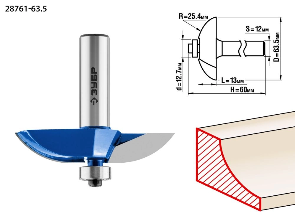 ПроизводителиФреза фигирейная №2, D= 63,5мм, раб. длина-13мм, радиус-25,4мм, хв.-12мм, d-12,7мм (28761-63.5) ЗУБР