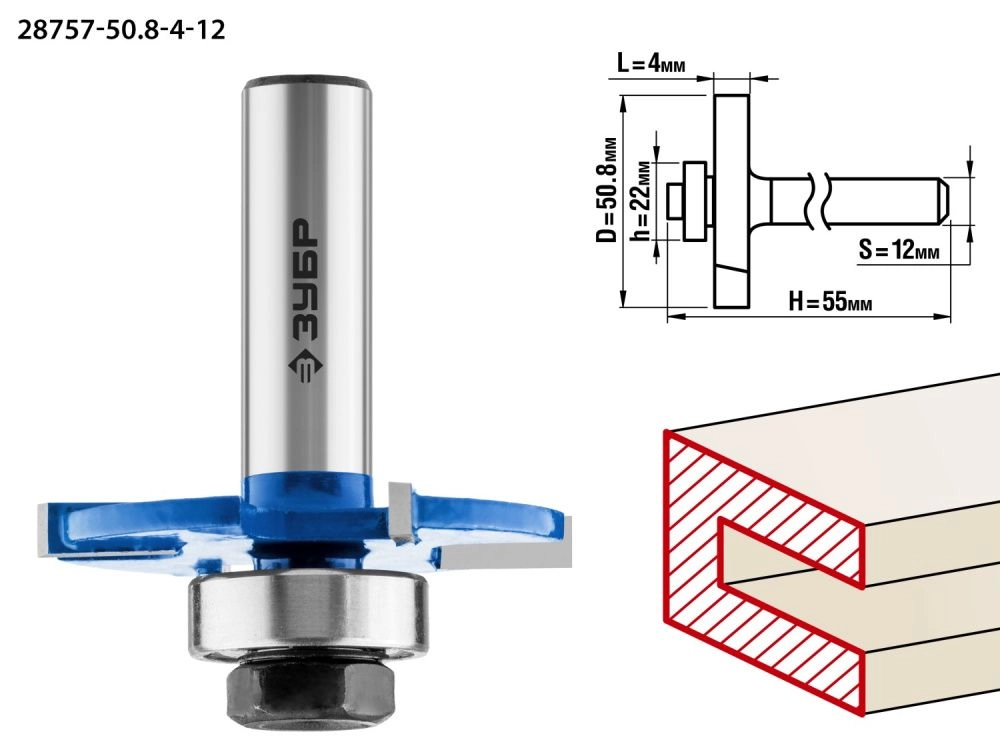 ПроизводителиФреза горизонтально-пазовая, D= 50,8мм, высота-4мм, хв.-12мм, d-22мм (28757-50.8-4-12) ЗУБР