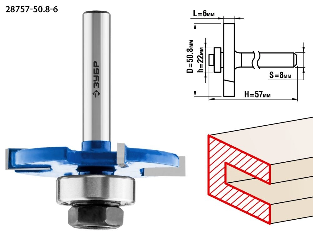 ПроизводителиФреза горизонтально-пазовая, D= 50,8мм, высота-6мм, хв.-8мм, d-22мм (28757-50.8-6) ЗУБР