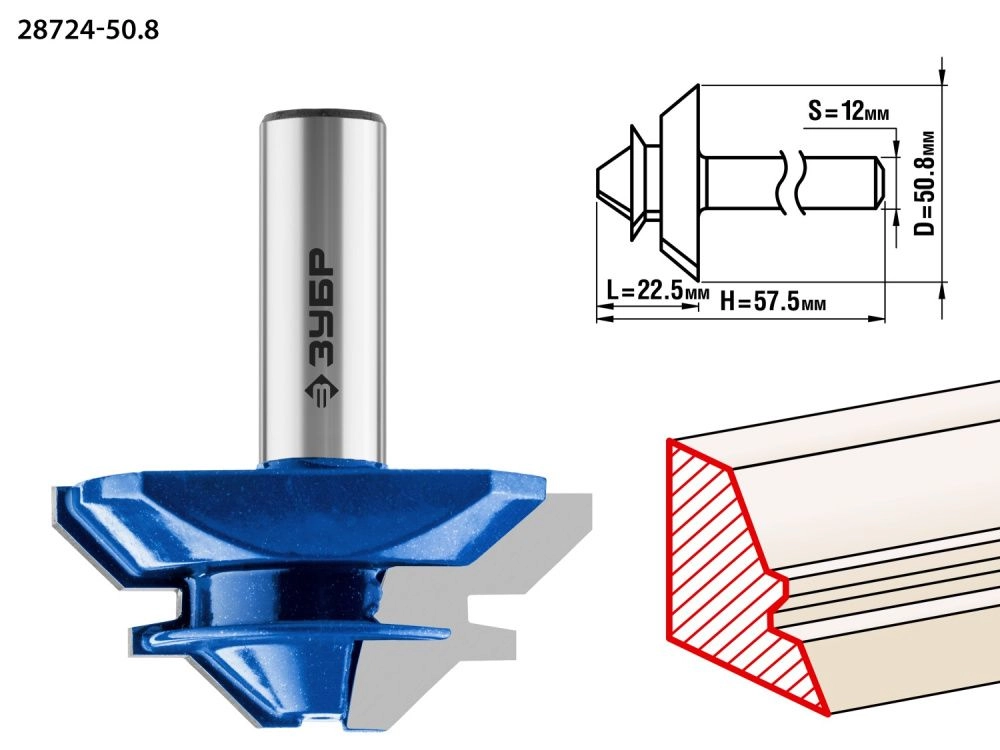 ПроизводителиФреза кромочная для углового сращивания, D= 50,8мм, рабочая длина-22,5мм,хв.-12мм (28724-50.8) ЗУБР