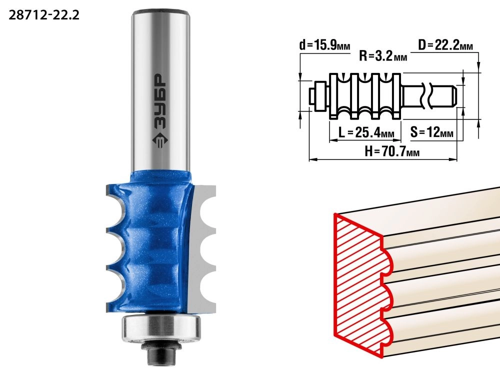 ПроизводителиФреза кромочная фигурная №1, D= 22,2мм, рабочая длина-25,4мм, хв.-12мм, d-15,9мм (28712-22.2) ЗУБР
