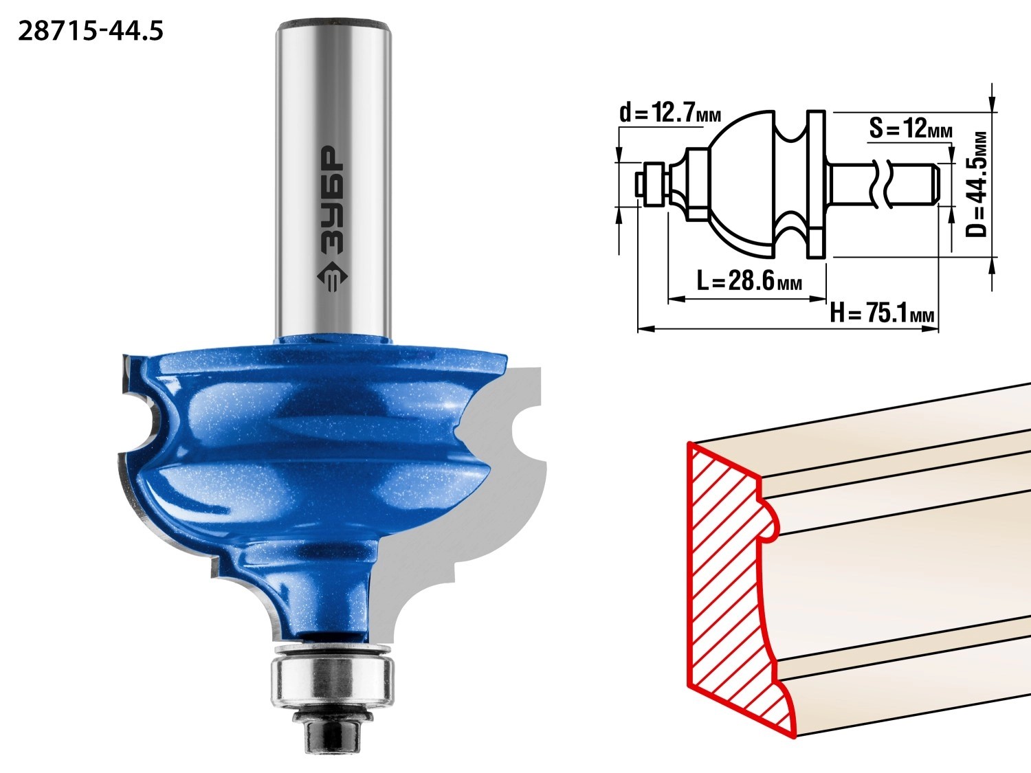 ПроизводителиФреза кромочная фигурная №4, D= 44,5мм, рабочая длина-28,5мм, хв.-12мм, d-12,7мм (28715-44.5) ЗУБР