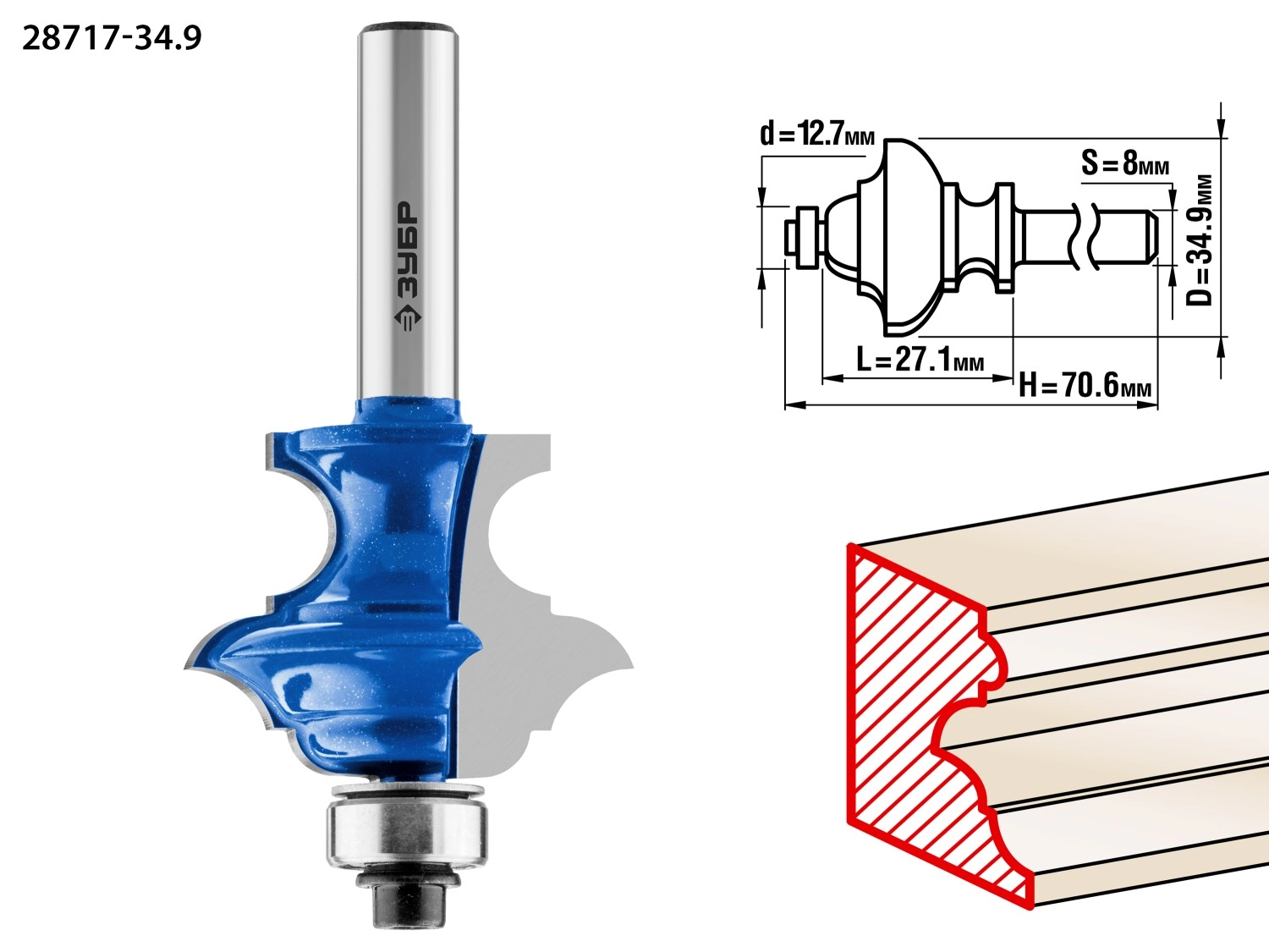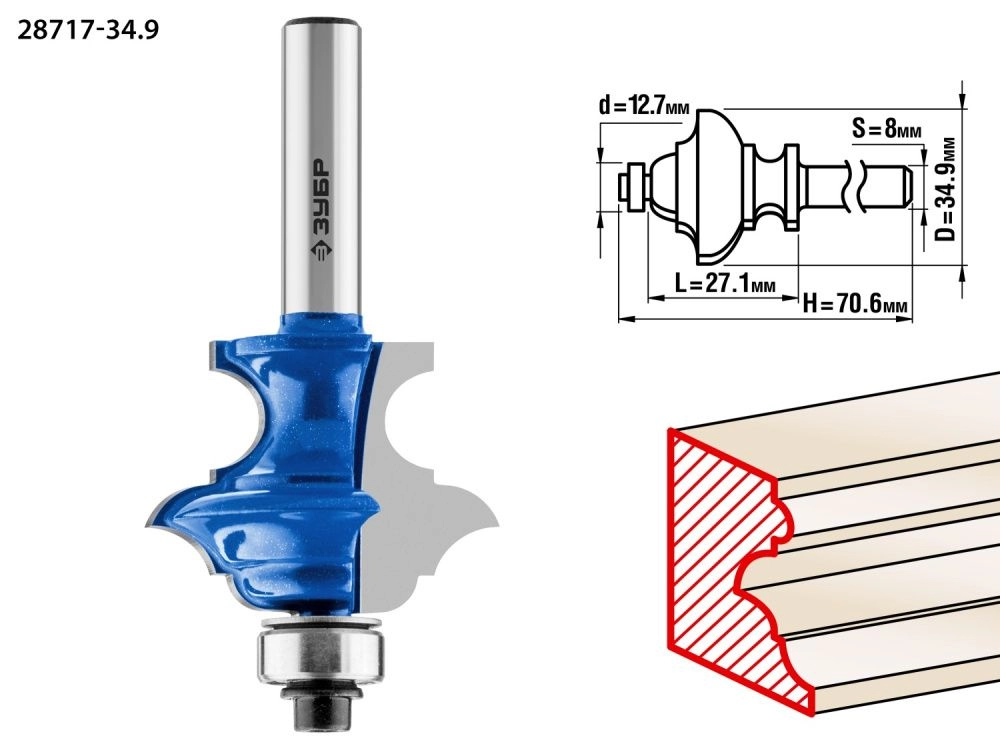 ПроизводителиФреза кром. фигурная №6, D= 34,9мм, раб. дл.-27,1мм, хв.-8мм, d-12,7мм (28717-34.9) ЗУБР