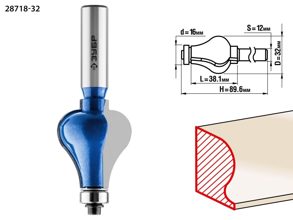 ПроизводителиФреза кромочная фигурная №7, D= 32мм, рабочая длина-38,1мм, хв.-12мм, d-16мм (28718-32) ЗУБР