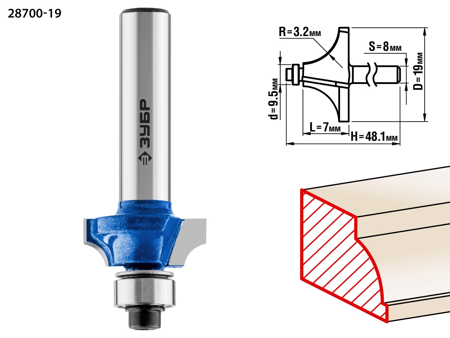 ПроизводителиФреза кром. калев. №1, D= 19мм, раб. дл.-7мм, рад.-3,2мм, хв.-8мм, d-9,5 мм (28700-19) ЗУБР