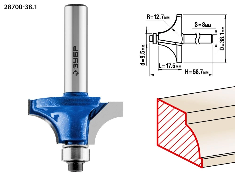 ПроизводителиФреза кром. калев. №1, D= 38,1мм, раб. дл.-17,5мм, рад.-12,7мм, хв.-8мм, d-9,5мм (28700-38.1) ЗУБР