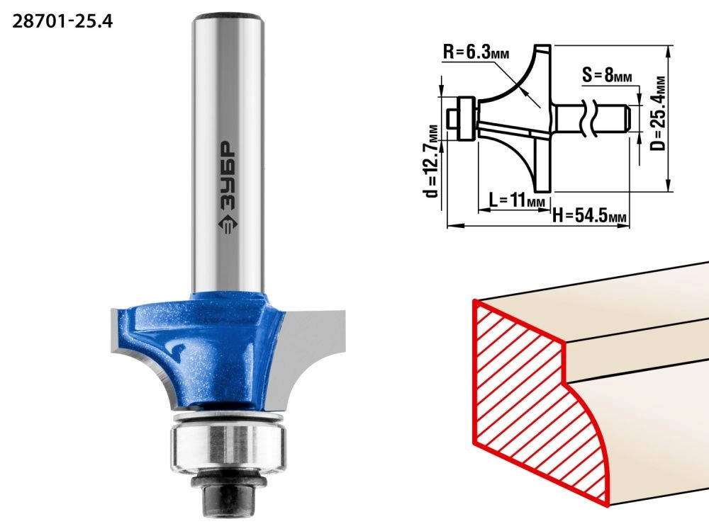 ХарактеристикиАртикул 28701-25.4Бренды ЗубрСтрана производства КитайТип изделия калевочнаяРабочая длина, мм 11Длина, мм 54.3Диаметр, мм 25,4Хвостовик 8Радиус, мм 6,3Диаметр подшипника, мм 12.7Вес 0.18Фреза отлично подходит для скругления кромок при обработке столешниц, полок, шкафов и прочих работ с разнообразными видами древесины