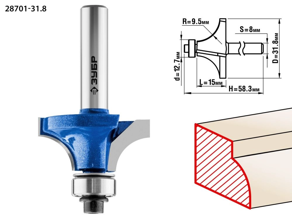 ХарактеристикиАртикул 28701-31.8Бренды ЗубрСтрана производства КитайТип изделия калевочнаяРабочая длина, мм 15Длина, мм 58.3Диаметр, мм 31,8Хвостовик 8Радиус, мм 9,5Диаметр подшипника, мм 12.7Вес 0.085Фреза отлично подходит для скругления кромок при обработке столешниц, полок, шкафов и прочих работ с разнообразными видами древесины