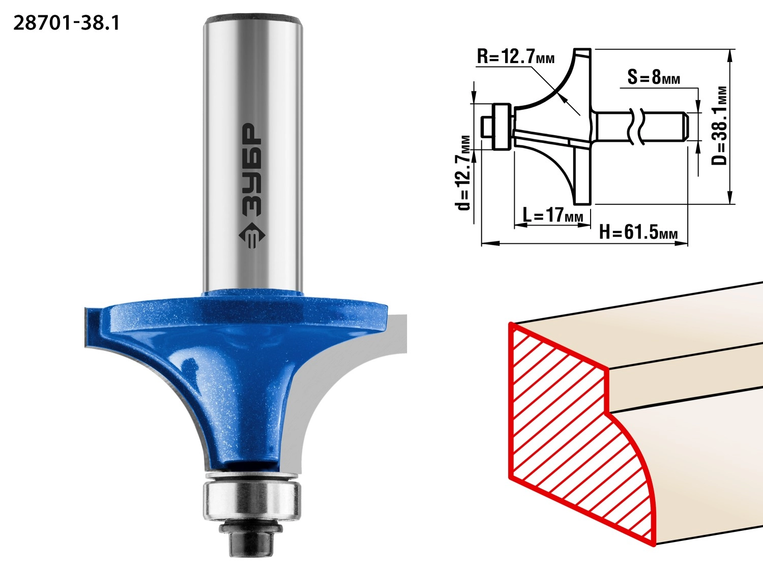 ХарактеристикиАртикул 28701-38.1Бренды ЗубрСтрана производства КитайТип изделия калевочнаяРабочая длина, мм 17Длина, мм 61.5Диаметр, мм 38,1Хвостовик 8Радиус, мм 12,7Диаметр подшипника, мм 12.7Вес 0.24Фреза отлично подходит для скругления кромок при обработке столешниц, полок, шкафов и прочих работ с разнообразными видами древесины