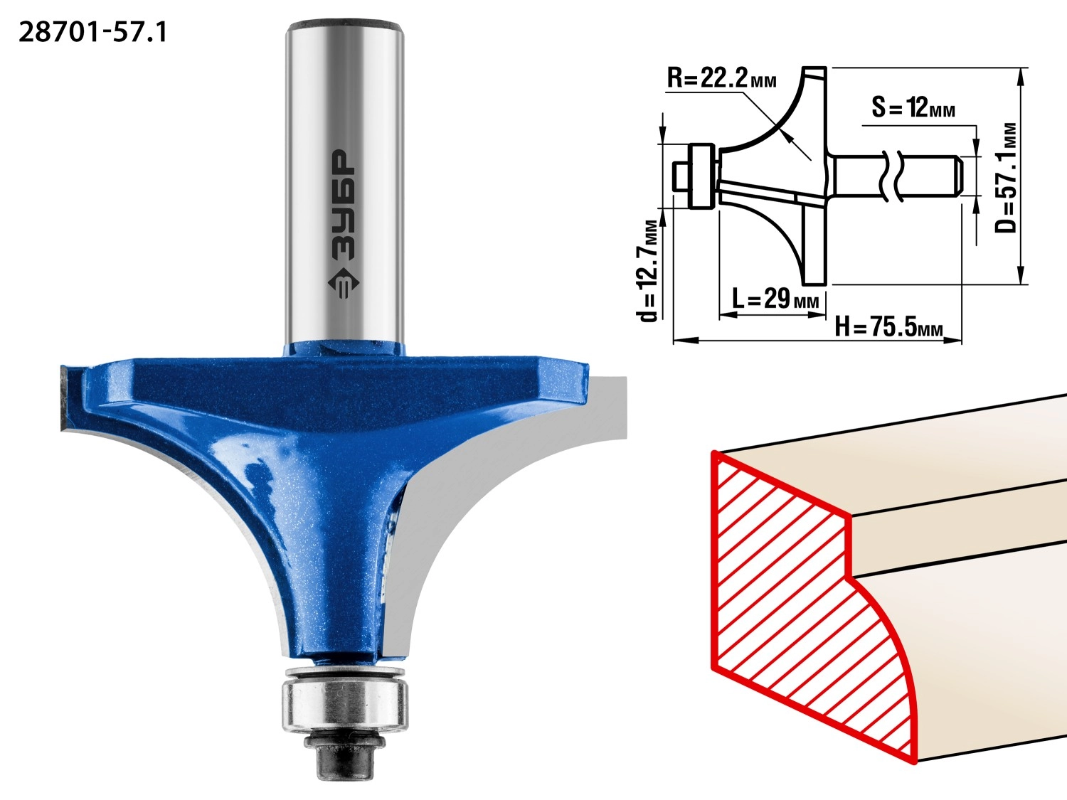 ХарактеристикиАртикул 28701-57.1Бренды ЗубрСтрана производства КитайТип изделия калевочнаяРабочая длина, мм 29Длина, мм 75.5Диаметр, мм 57,1Хвостовик 12Радиус, мм 22,2Диаметр подшипника, мм 12.7Вес 0.208Фреза отлично подходит для скругления кромок при обработке столешниц, полок, шкафов и прочих работ с разнообразными видами древесины