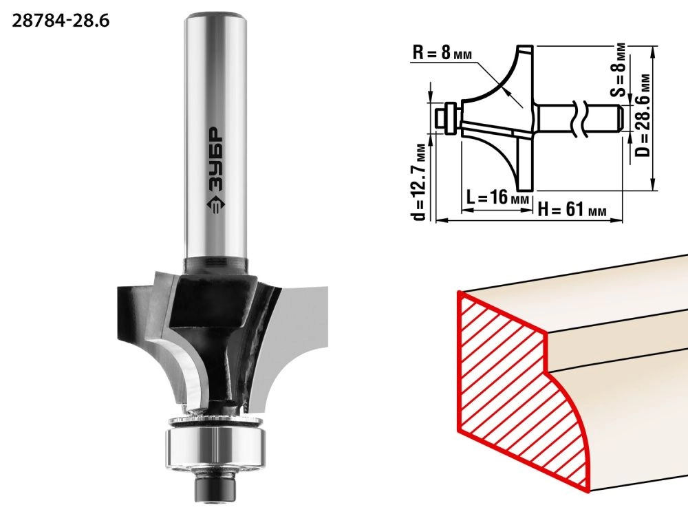 ХарактеристикиАртикул 28784-28.6Бренды ЗубрСтрана производства КитайТип изделия калевочнаяРабочая длина, мм 16Длина, мм 61Диаметр, мм 28,6Хвостовик 8Радиус, мм 8Диаметр подшипника, мм 12.7Вес 0.088Фреза отлично подходит для скругления кромок при обработке столешниц, полок, шкафов и прочих работ с разнообразными видами древесины