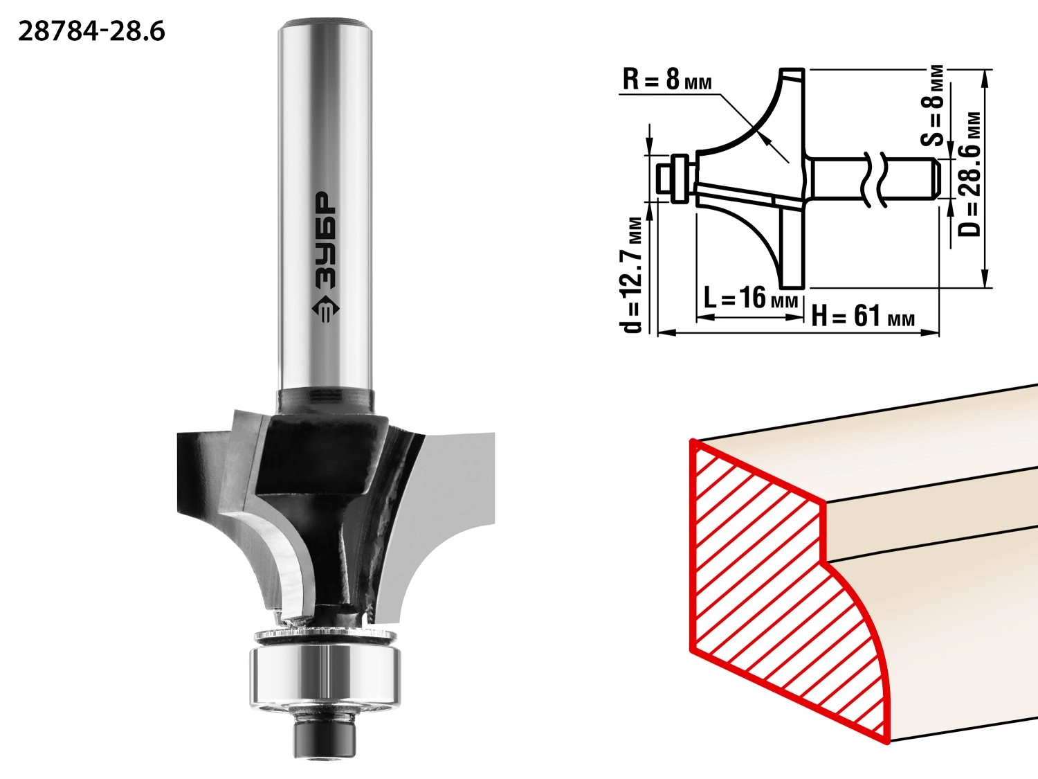 ПроизводителиФреза кром. калев. №1, диам.-28,6мм, раб. дл.-16мм, рад.-8мм, хв. 8мм (28784-28.6) ЗУБР