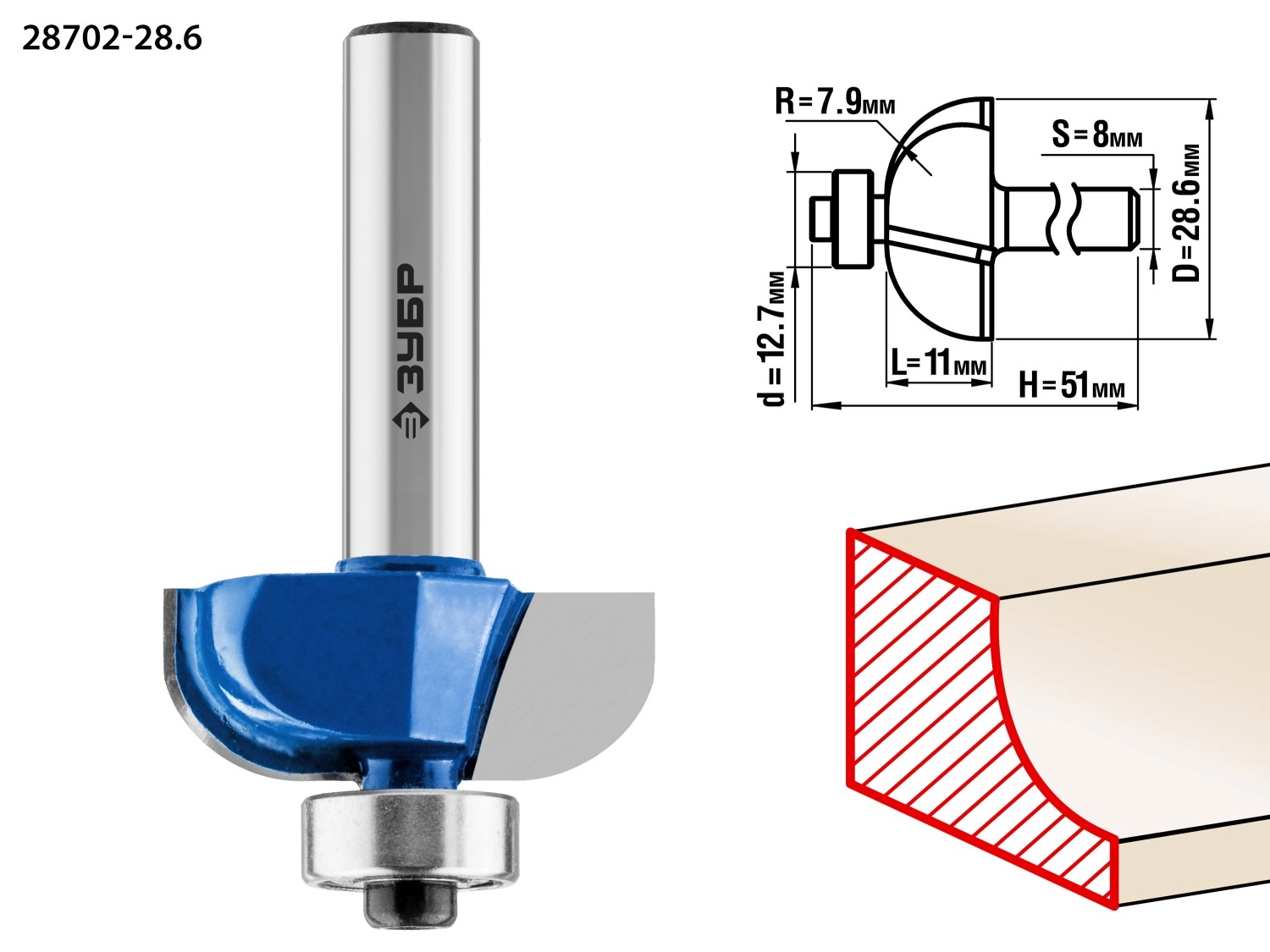 ХарактеристикиАртикул 28702-28.6Бренды ЗубрСтрана производства КитайТип изделия калевочнаяРабочая длина, мм 11Длина, мм 51Диаметр, мм 28,6Хвостовик 8Радиус, мм 7,9Диаметр подшипника, мм 12.7Вес 0.068Фреза отлично подходит для скругления кромок при обработке столешниц, полок, шкафов и прочих работ с разнообразными видами древесины